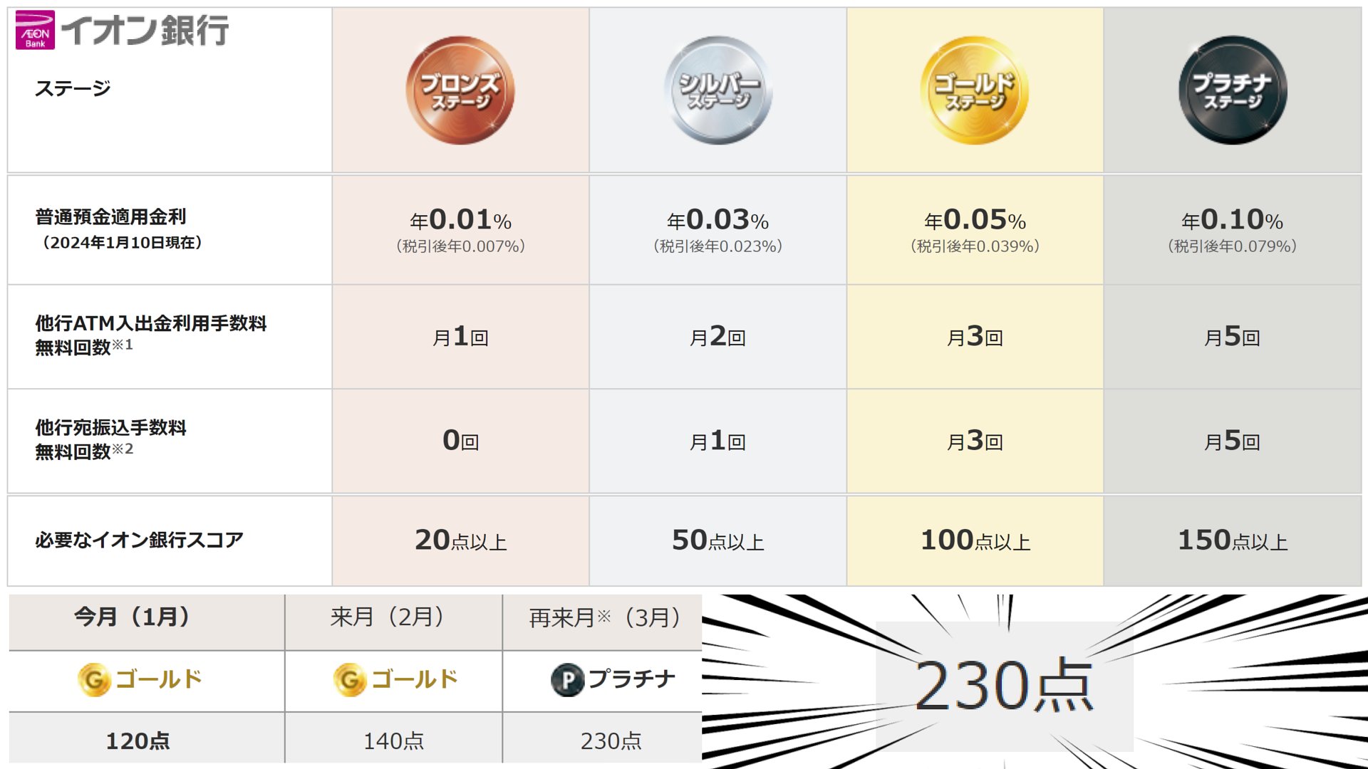 まず、私が預金先の一つとしている「イオン銀行」では、様々な金融サービスの利用状況に応じて点数が貰え、それによって「Myステージ」と呼ばれるランクが上がっていく。最高位のプラチナステージでは、「年利0.1%」という、郵便局の100倍の利子が得られるので、私はこれを目指したいと思った。
