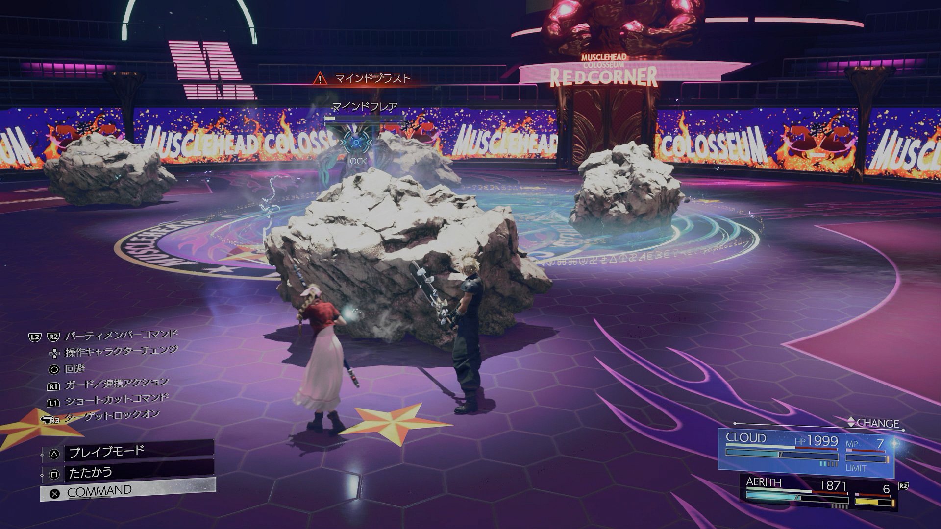 また、戦闘面でも、ペルソナばりのオサレBGMの中で、死んだふりからの強烈なカウンターを当ててきたり、素早い動きでこちらの攻撃を回避したり、クラウド1人なのに拘束攻撃を当ててきたりと、侮れない強敵になっている。さらに、ときおり、強化ステータスが付与される光の球が流れてくるので、それを敵に拾われる前に回収するのが重要というマッスルタッグマッチが、何の説明も無く導入されていたりする。最後に、当初は1体と戦うことになり、それだけでも勝つのには苦労するが、上級編では2体が登場し、2体でボイスが異なる謎の豪華仕様で、バトルを盛り上げてくれる。