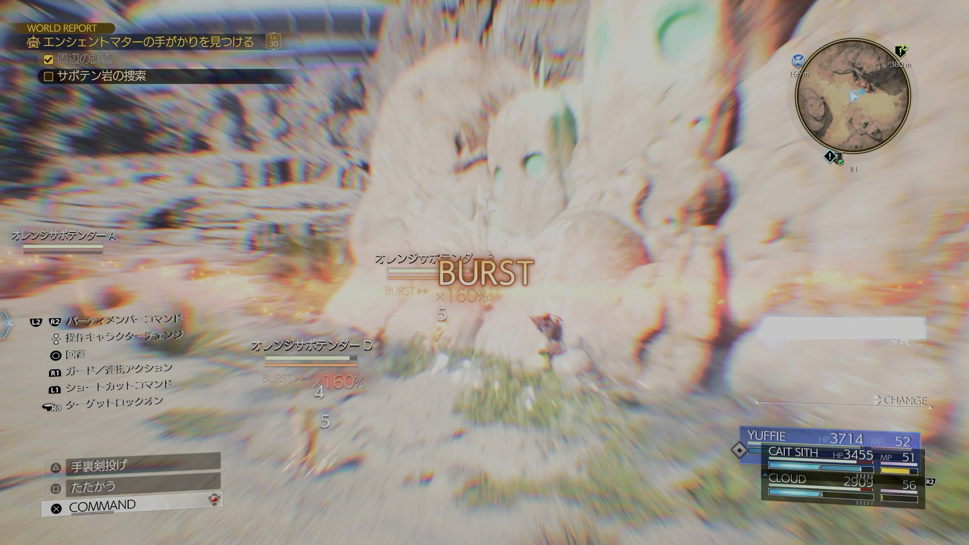 というわけで、ケット・シーの戦い方は、クラウドさんが「バーストスラッシュ」でバーストして「ブレイバー」を叩き込んだり、「ラピッドチェイン」の連発で雑魚を殲滅する…という、このゲームの基本的な流れに、全く入り込めないのだ。