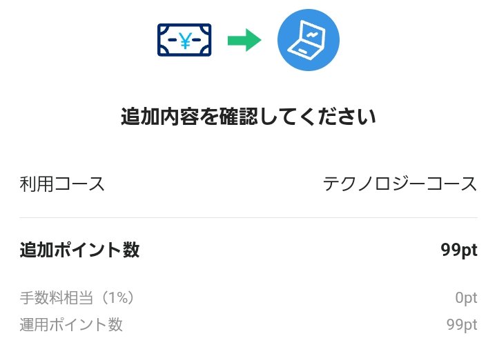 …ところで。このPayPayポイント運用については、これまで、資金の追加時に1%の手数料が掛かるという点で尻込みをしていた。が、99ポイントずつ追加するというアホみたいな方式で、この手数料は抜けられることが分かったので、それを使い、まずは本日夜の時点で得られていた2500ポイントを、NASDAQ-100に投資をしてみた。懲りないな〜私も!