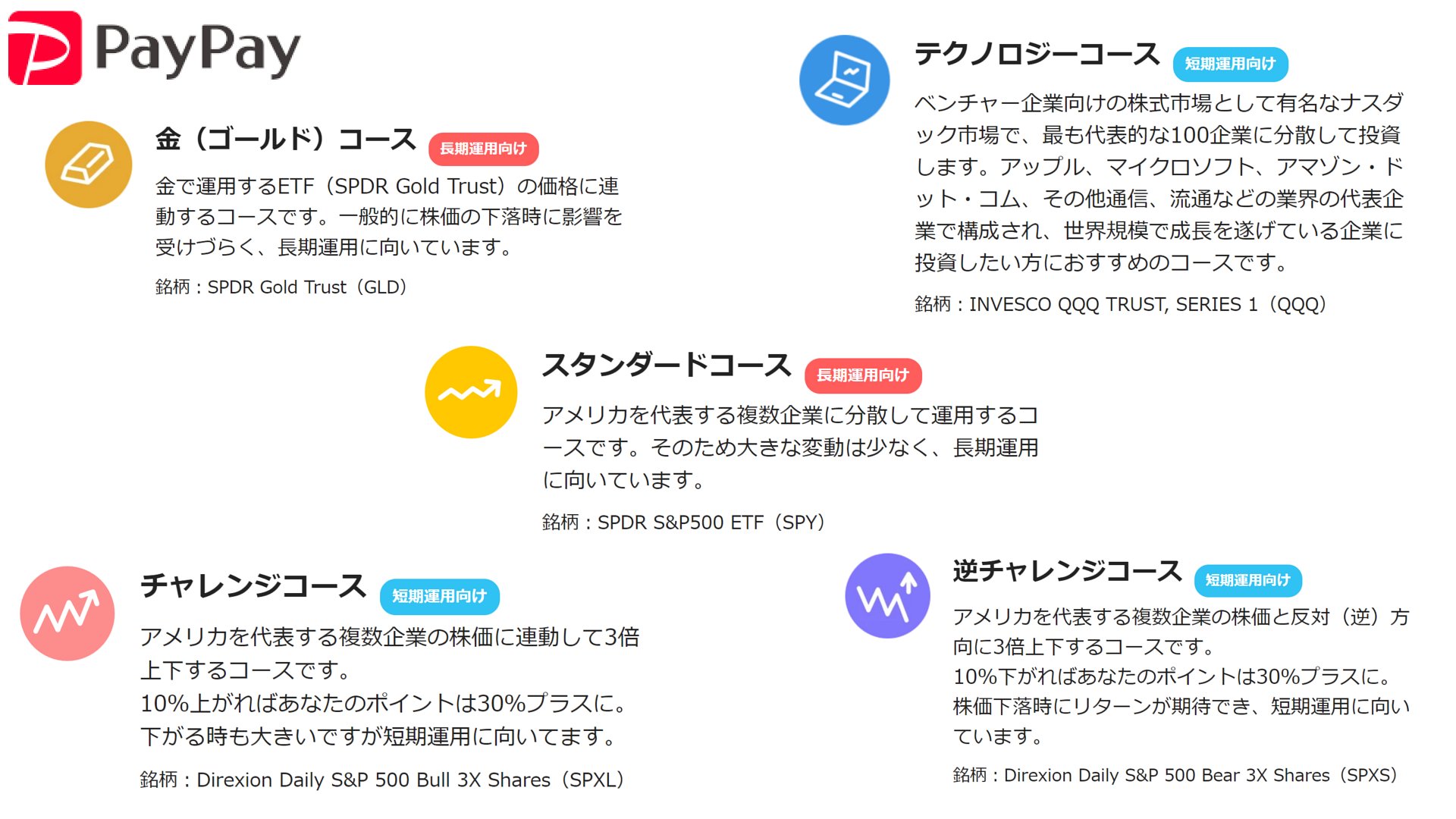 ちなみに、そうまでして集めたPayPayポイントの使い道であるが、やはりというか何というか、投資をしていくことにしたい。PayPayにも、楽天ポイント運用とほぼ同じく、ポイント(PayPayマネー/マネーライト/ポイントのうち、「ポイント」のみ)を投資に使えるサービスがある。コースは、楽天ポイント運用の「2つ」(全世界株+全債券のうち、割合が異なるだけ)に対して、PayPayポイント運用では、「5つ」が存在する。文面から判断するに、「金(ゴールド)」「S&P500」「NASDAQ-100」「S&P500×3倍ブル」「S&P500×3倍ベア」を表しているようだ。ブルとベアは予言者専用商品であり、ゴールドは世界恐慌でも起こらない限り真価を発揮してくれないため、狙い目はS&P500(全米株)かNASDAQ-100(米ハイテク企業)のどちらかだ。どうせなら、