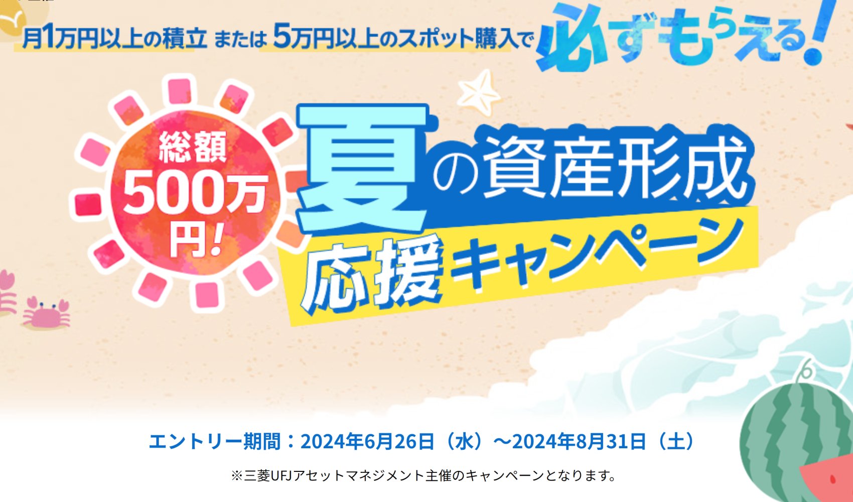おまけである。本日、楽天証券にて、新たなキャンペーンが開催された(【楽天証券の紹介ページ】)。対象の投資信託に対して、月1万円の積立、または5万円のスポット購入をすることで、総額500万円がプレゼントされるという施策であり、主催は「三菱UFJアセットマネジメント」だ。「は?