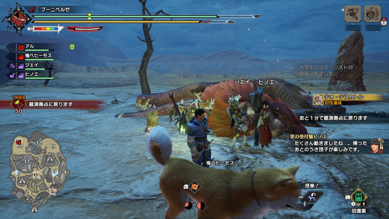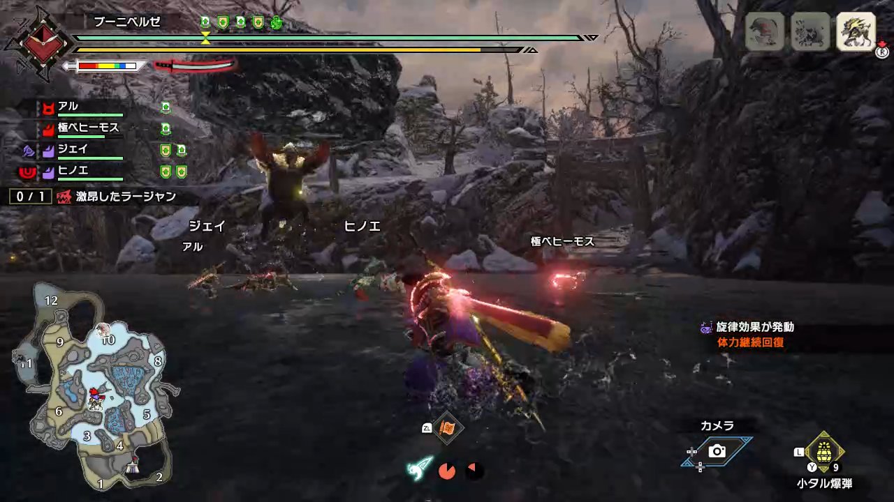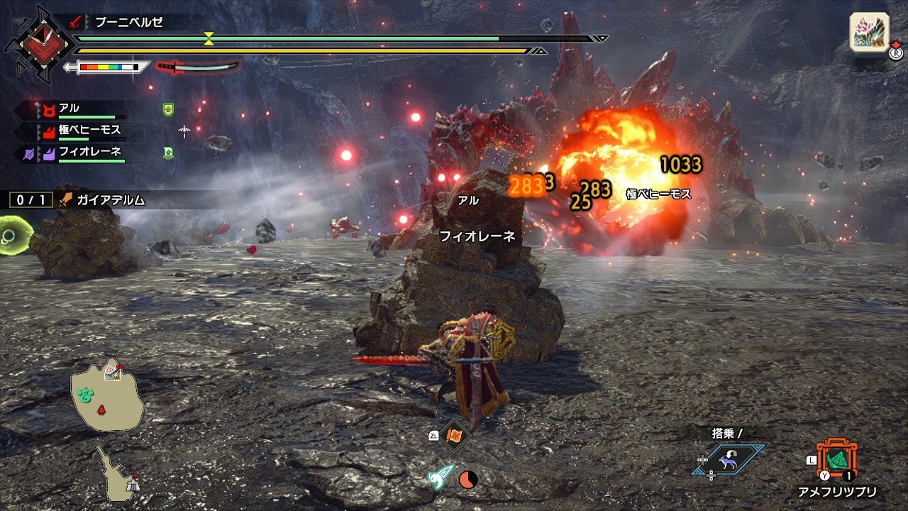 そして。こいつは、当初の計画では、アップデートでの最後のボスという扱いであったらしい(実際は、“ボーナスアップデート”の「原初を刻むメル・ゼナ」が最後)。というわけで、これまでの敵とは異なり、普通に強い。序盤は大したことがないものの、バトルが第2段階に進むと、攻撃範囲・火力・スピードともに、かなりのものとなり、緊張感のある戦いが続く。ただ強いというだけではなく、設置型のバリスタ&大砲や、特殊な手段でしか回避できない大技(モドリ玉で避けました…)に、通常とは異なる方式での乱入モンスターなど、独自仕様も凝っている。