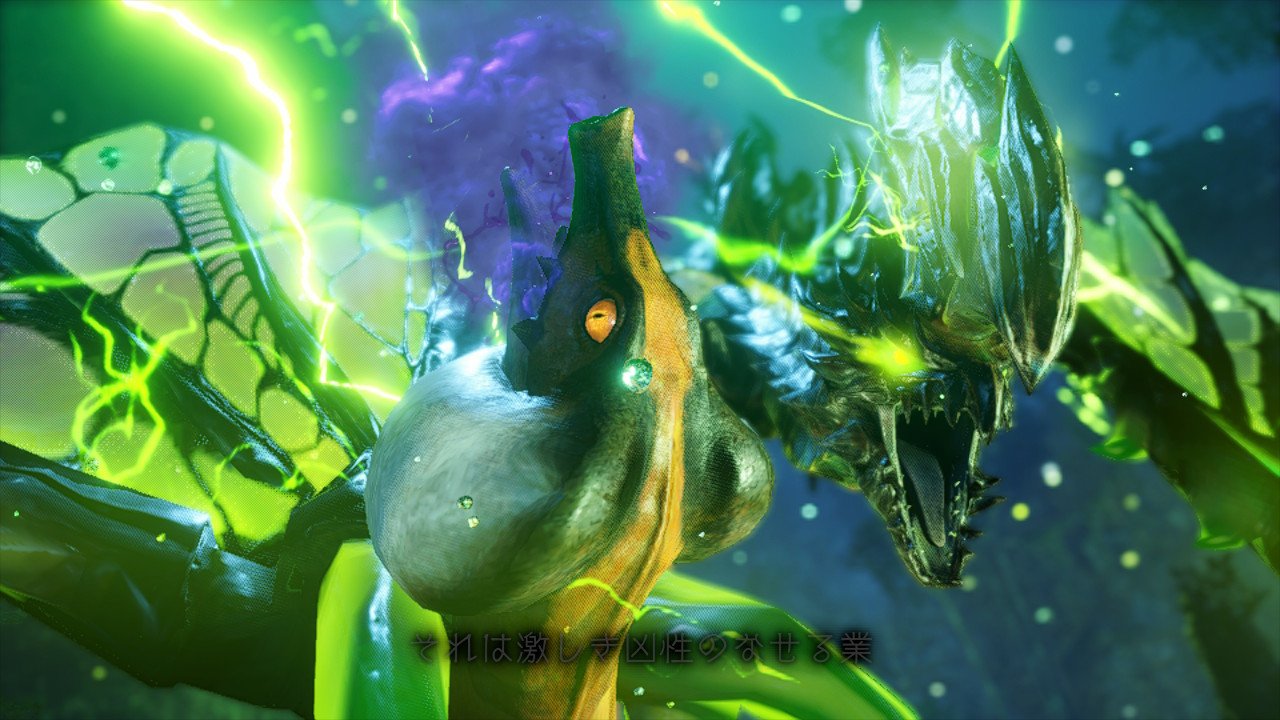 …まず、なんというか、敵の動きが速すぎる。骨格としてはイヤンクックのような感じであるが、羽根…というか腕を使ったパワフルなパンチ攻撃に、電撃や尻尾を使った攻撃など、動作が多彩で読みづらい。さらに、世界観的にも、なんというか、割り切った感じの表現となっており、ライゼクスから見て前方の左右45°の位置に、緑色の光の柱を設置し、そこから更に電撃が左右45°に発射されるという攻撃は、いかにもゲーム的で笑ってしまうが、威力は全く笑えない。そして、トサカを光らせて振り下ろす必殺技は、なんとライトニングブレードなる闇落ちしたネーミングセンスになっているらしい。一応、かつてのモンハンは、厳しい自然環境での生存競争なんかをテーマとした作品だったのだ…。