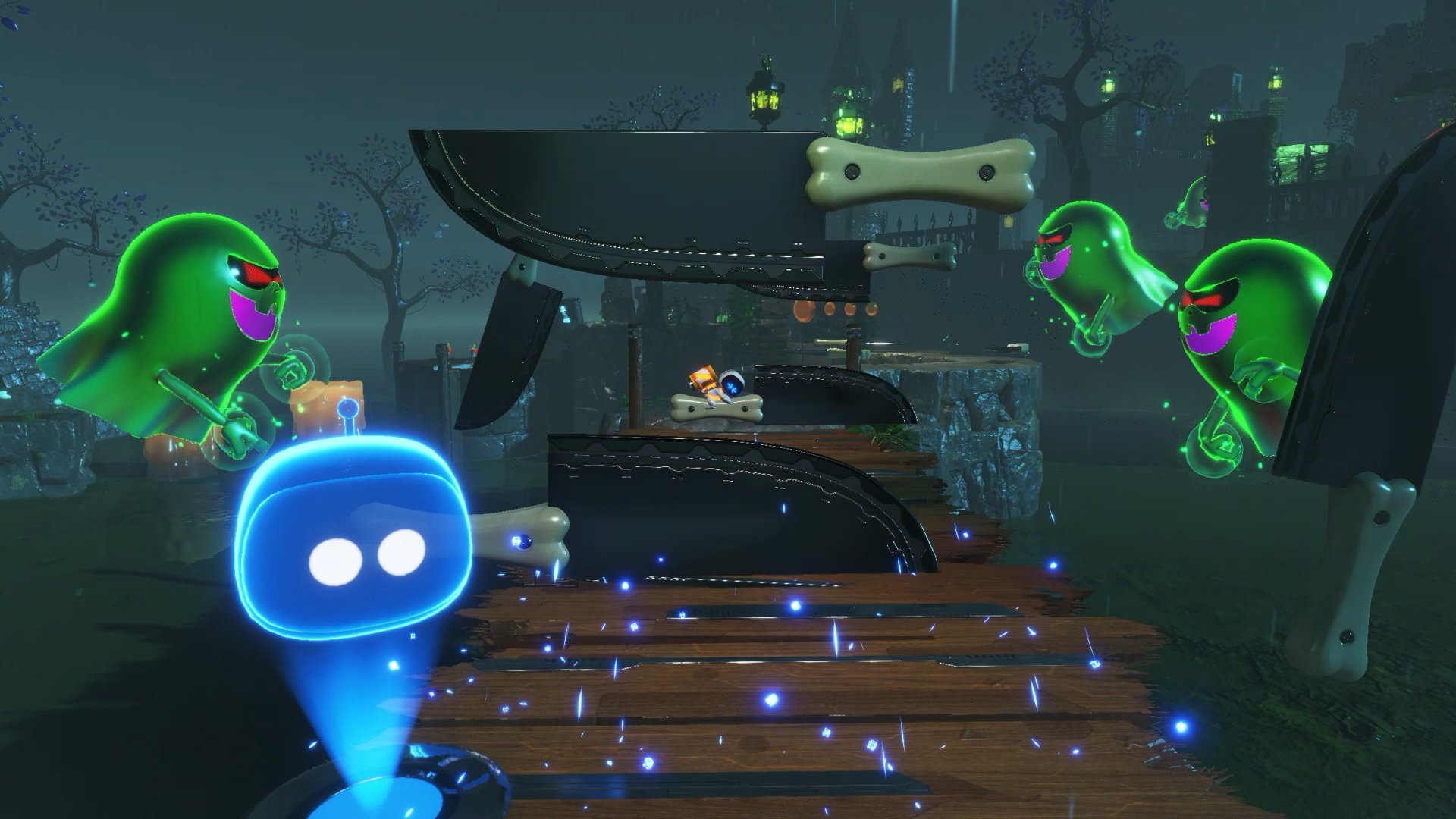 …まず、1回目は、お化け屋敷のようなステージを進んでいく「トリック・オア・ストップ!」である。ここでは、おばけたちが投げナイフ大会をしており、通常だと早すぎて見えないのだが、タイムストッパーを適用することで、その間をすり抜けられるようになる。やれ、ゲーム的な都合ということなのだろうが、一糸乱れぬ動きで高速のナイフ投げをしていく幽霊たちは必見である。ぜったい生きてた頃より楽しんでる。