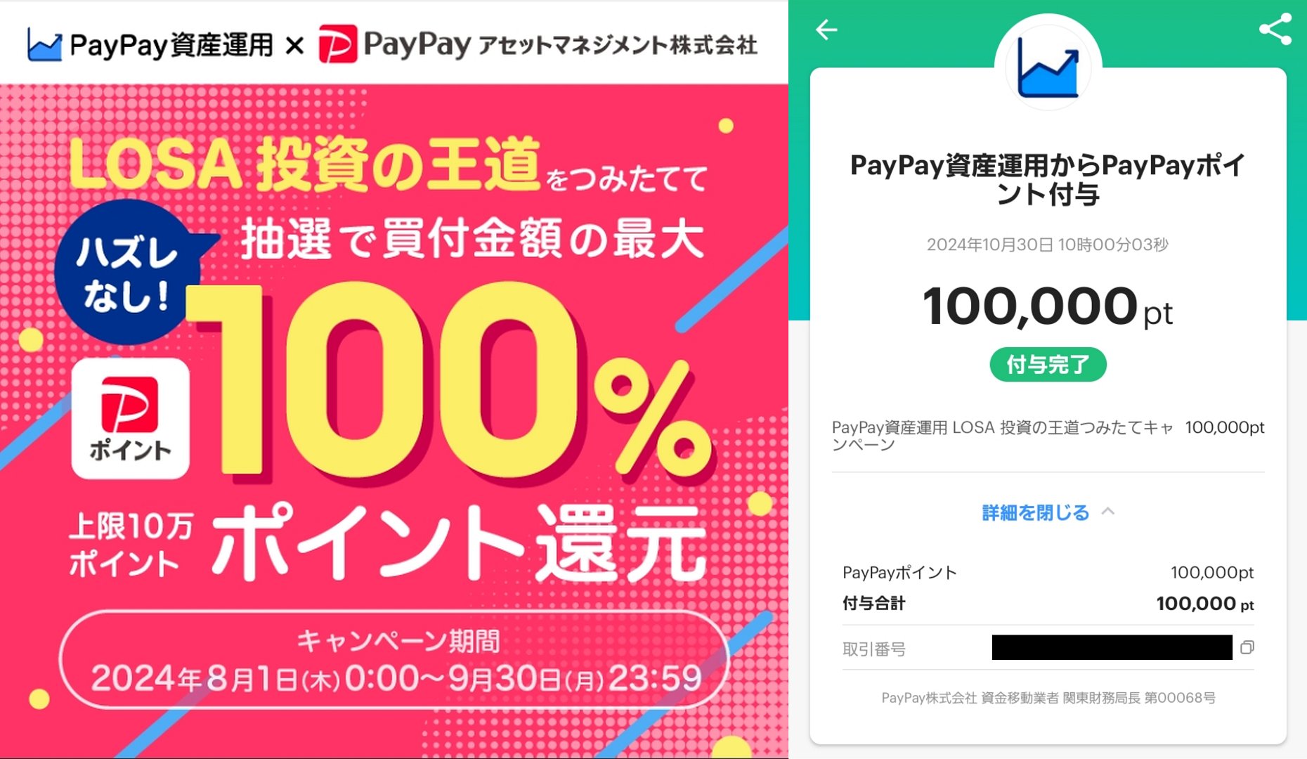 そういうわけで。私は、3等の「0.5%還元(上限:700ポイント、1等2等が外れた全員)」が当たれば良いかな…と思って、7万円×2回に分けて、計14万円ぶんの「LOSA 投資の王道」を、9月末ごろに購入した。それが、1等の「100%還元(上限:100000ポイント、11本)」に命中したのである。やれ、買わせたいのが14万円なのか10万円なのか分からないが、PayPay証券にはよくあることだ。