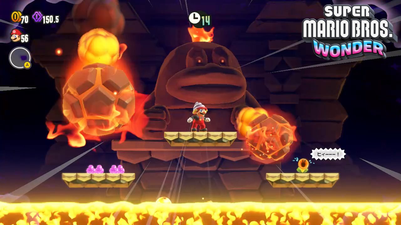 …また、アクション面については、難しいと言えば難しいのだが、ただまあ、5段階あるうちの★4が上限であり、それ以上のステージが登場することは無かった。その印象に反して、作中世界では高難易度という扱いらしい。例えば、上の画像で記したワンダーフラワーでは、巨大なガボン像が、画面奥から炎の球を吐いてくる。ただ、ゲームにありがちなこととして、左・中央・右と、明確にエリア分けがされている。しかも、発射から攻撃判定が発生するまでが長いうえ、先置き・フェイント・2個所同時攻撃などといった、ひねった要素も無いため、普通にぴょんぴょんとジャンプしているだけで回避できる。まあ、「自機」を正確に狙ってくるということで、友達が居れば難しくなるのかもしれないが、私にとってはノーダメージ余裕であった。