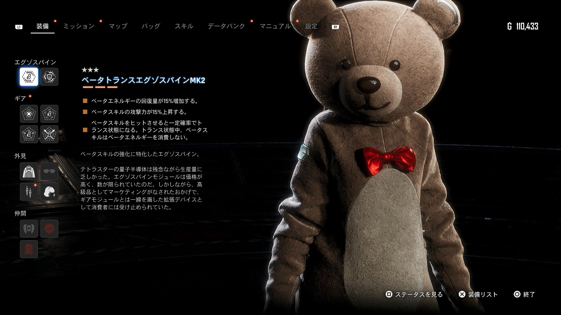 ――ちなみに。このゲームで最も目を引く要素は、セクシーな女主人公が登場するという点だ。実際、Twitter(現:X)で『ステラーブレイド』という用語で検索をしてみても、ほぼ100%、女主人公であるイヴのフォトモード画像で埋め尽くされている。まあ、私も、全く気を惹かれなかったかというと、嘘になるのだが、ただ、そこまで女主人公だけを目当てとして購入&プレイをしていたわけではない。実際、私の日記のスクショを見てみても、露出度の低い服(パンツスタイルや、クマの着ぐるみなど)を使っていることが多いし、文章内容としても、バトルを始めとするアクション面や、BGM、収集要素、そしてカッチョいいイベントシーンなどに触れていることのほうが多い。今作は、女主人公であることが必須のゲームだが、必ずしもそのビジュアルだけで成り立っている作品では無いと言える。それに、私は、ロリコンじゃないけど、ちっこくてかわいい感じの人のほうが好きだし…。