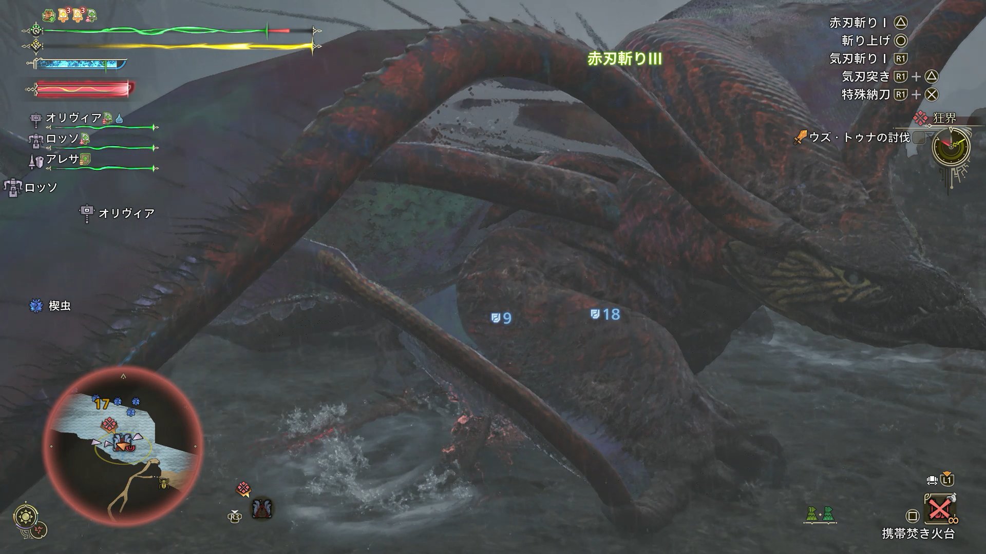 …さて、このウズ・トゥナ戦で印象に残ったことは、2つある。まず、良い意味で印象的だったのが、波を使った攻撃だ。“ゲームに登場する水属性のモンスター”ということで、ウズ・トゥナも、水流を発生させて攻撃してくるのだが、今作では、PS5世代のハードの性能を活かして、説得力のある見た目になっている。足を取られる厄介な技だが、グラフィックが向上すると、その受け取り方も変わってくるというものだ。