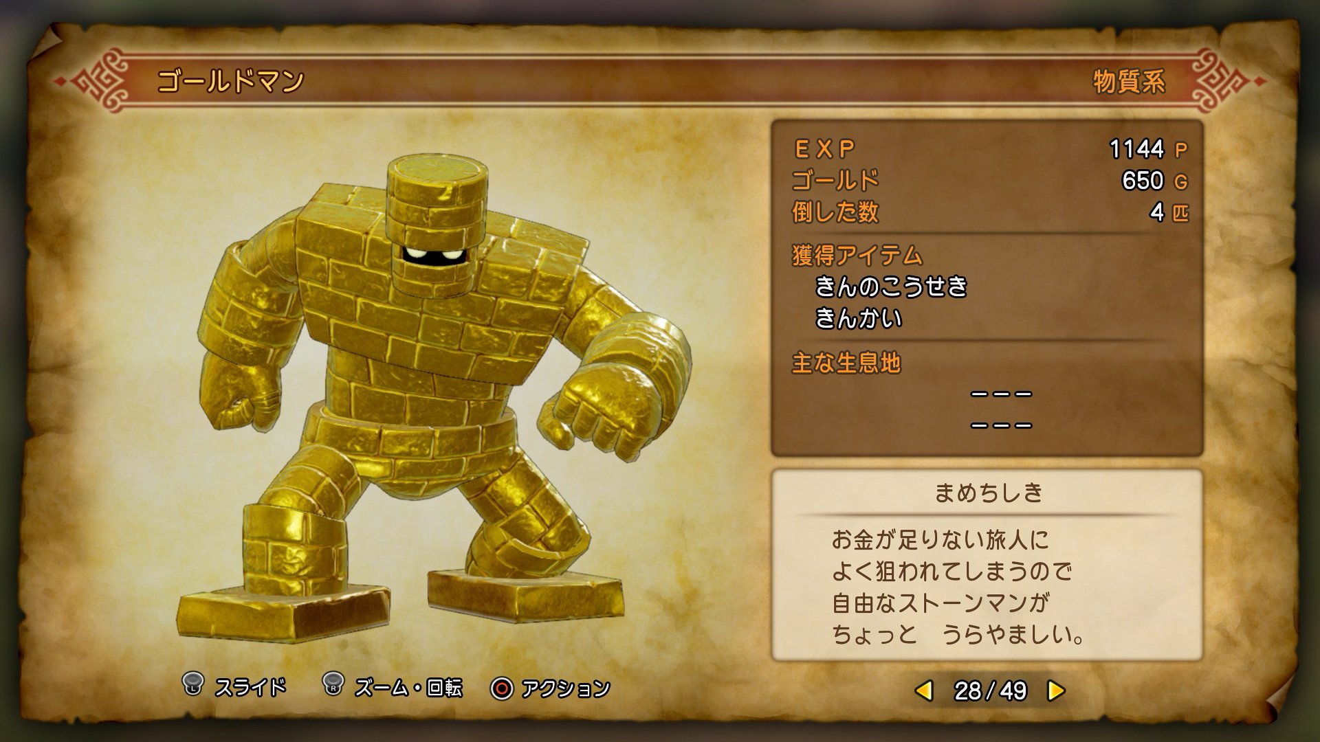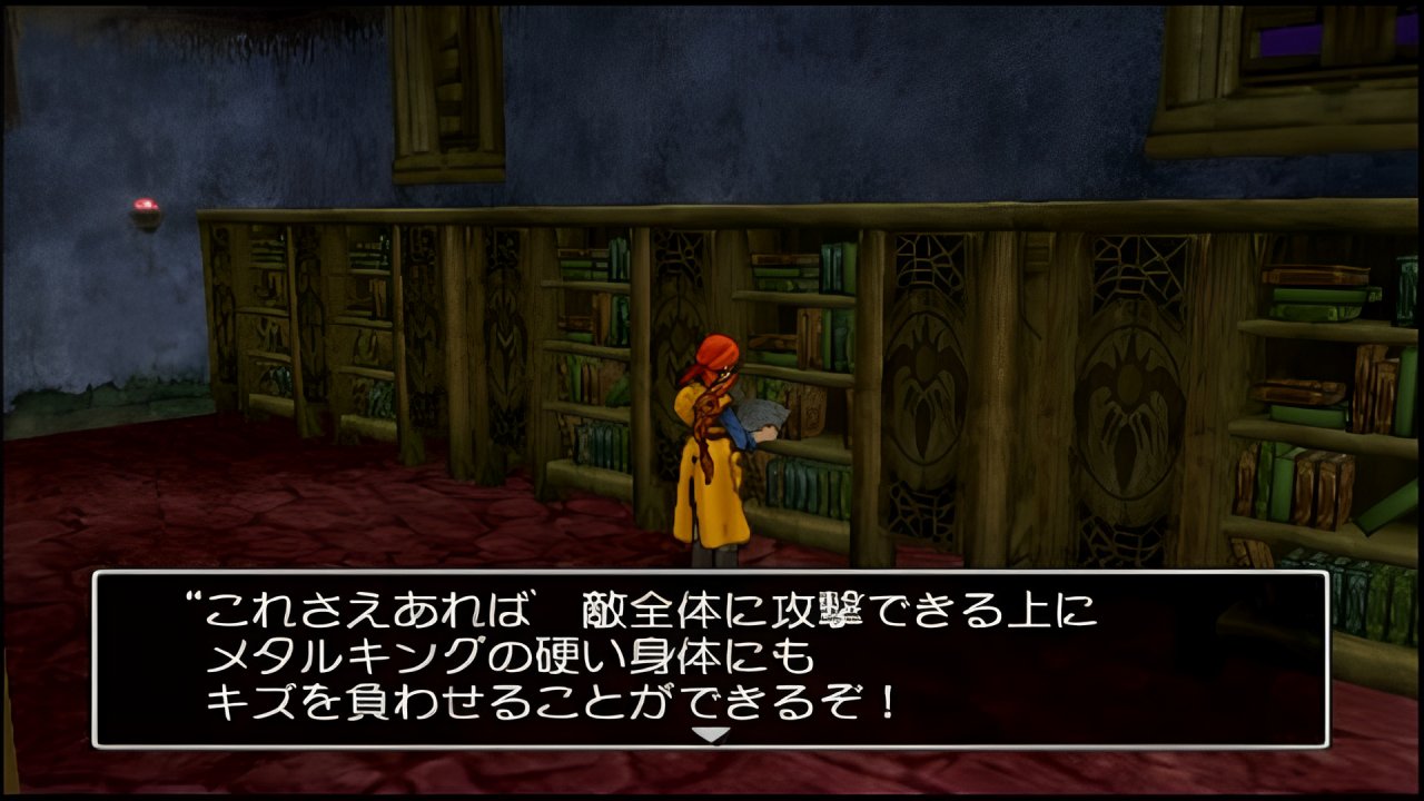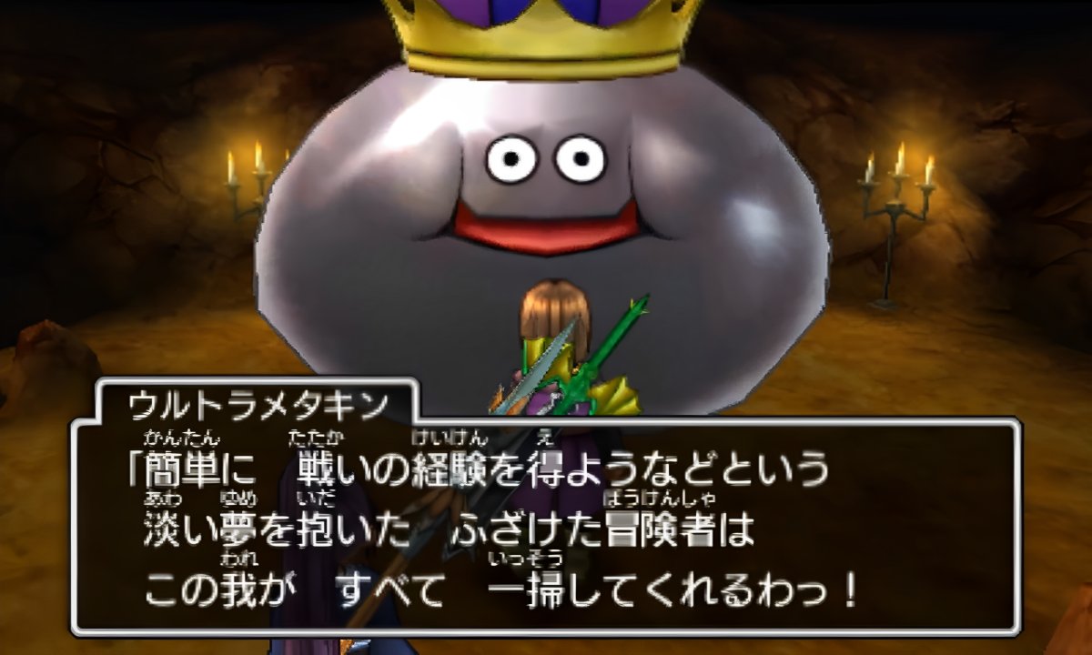 ――ちなみに、ここでの悩みとして、お金が足りず、装備が全く買えない。3DS版ということで、雑魚戦の回避は容易である。また、ドルマゲスを倒すと、それより強いボス(ストーリー攻略上の体感という意味ではなく、純粋にパラメーターで上回る敵)は、とうぶん登場しない。さらに、3DS版でメタル狩りが容易になってしまった都合、経験値に困ることは無くなったのだが、メタル系モンスターはお金についてはほとんど落とさず、お金版のメタルスライムと言えるモンスターも存在しない(「ゴールドマン」という敵も出るが、せいぜい数百ゴールドである)。経験値に関するストレスが無くなった今、余計に資金不足のほうを強く感じてしまうというものである。あれか、ドラクエシリーズは、毎作必ず現実的で嫌な気分になるシーンを入れてくるが、資金不足がそれなのか。