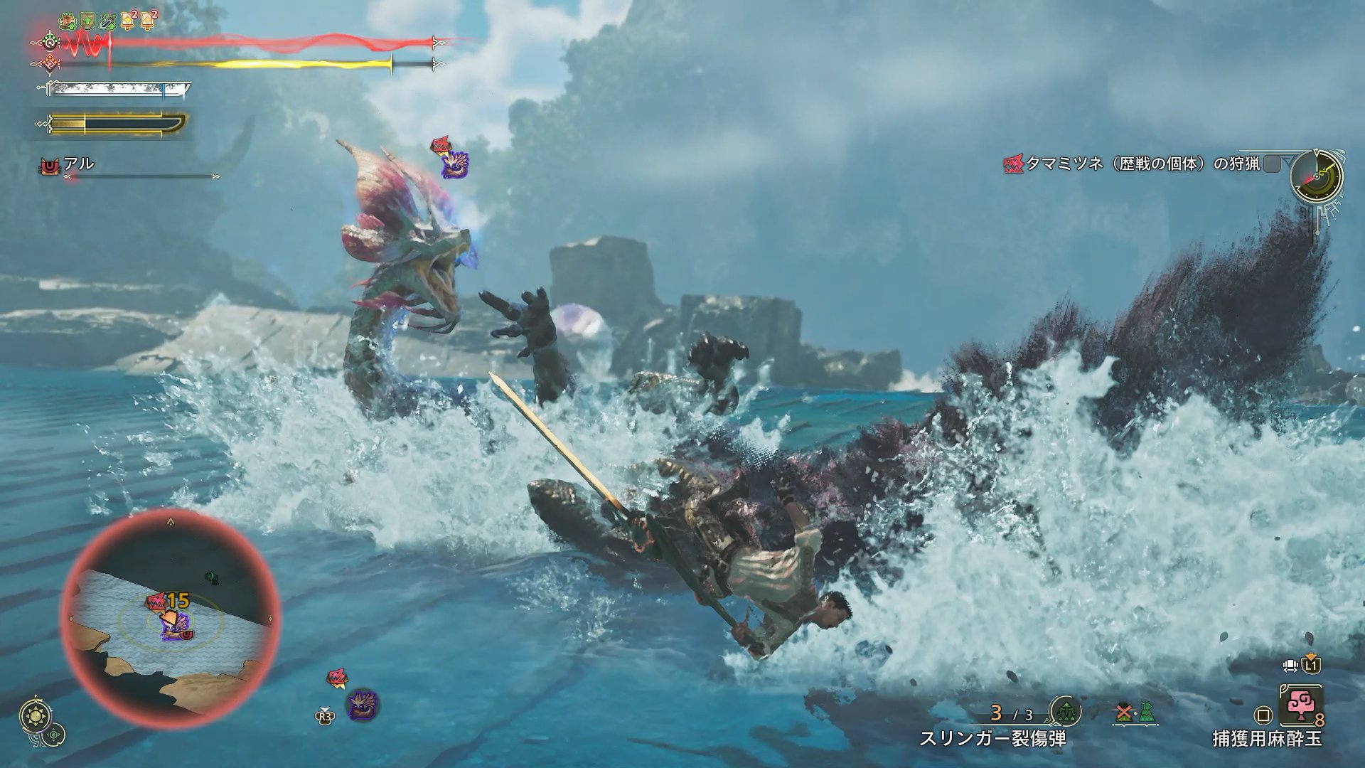 ――とはいえ、後から動画で振り返ってみると、一応は、大きめの専用咆哮を、予備モーションとして持っているようだ。やれ、“咆哮からの尻尾ビターン”というと、モンハン老人会ということで、『2ndG』のナルガクルガを思い出してしまう。ただ、明らかにヤバいと分かるあちらに比べ、タマミツネのそれは、声も小さく、出も早い。さらに、ナルガクルガの尻尾には、“怒り状態だと狙いが少し逸れて避けやすくなる”という緩和策があったが、タマミツネにはそんなものはなく、プレイヤーが横から攻撃をしているような場合であっても、正確な誘導を行ってくる。それでいて、全般的にダメージが控えめのワイルズ環境において、一撃でHPの8割を削ってくるのだ。強すぎる…。