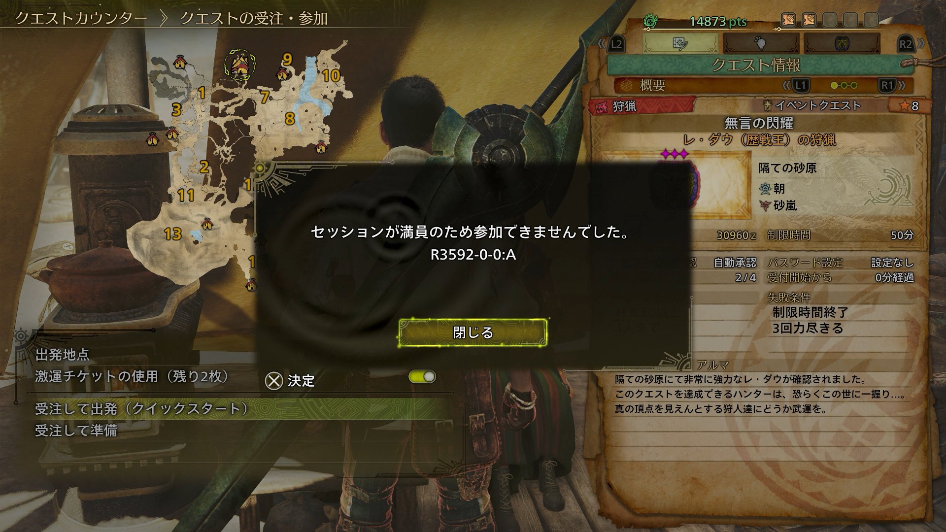 というわけで、私は、まず@の「救難信号が出ているクエストに参加する」という手段を使って、「歴戦王レ・ダウ」のそれを選び、開始しようとしてみた。だが、一瞬で4人の枠が埋まってしまって、なかなか参加ができない。いや、“なかなか”どころではなく、全くゲームが始まらない。
