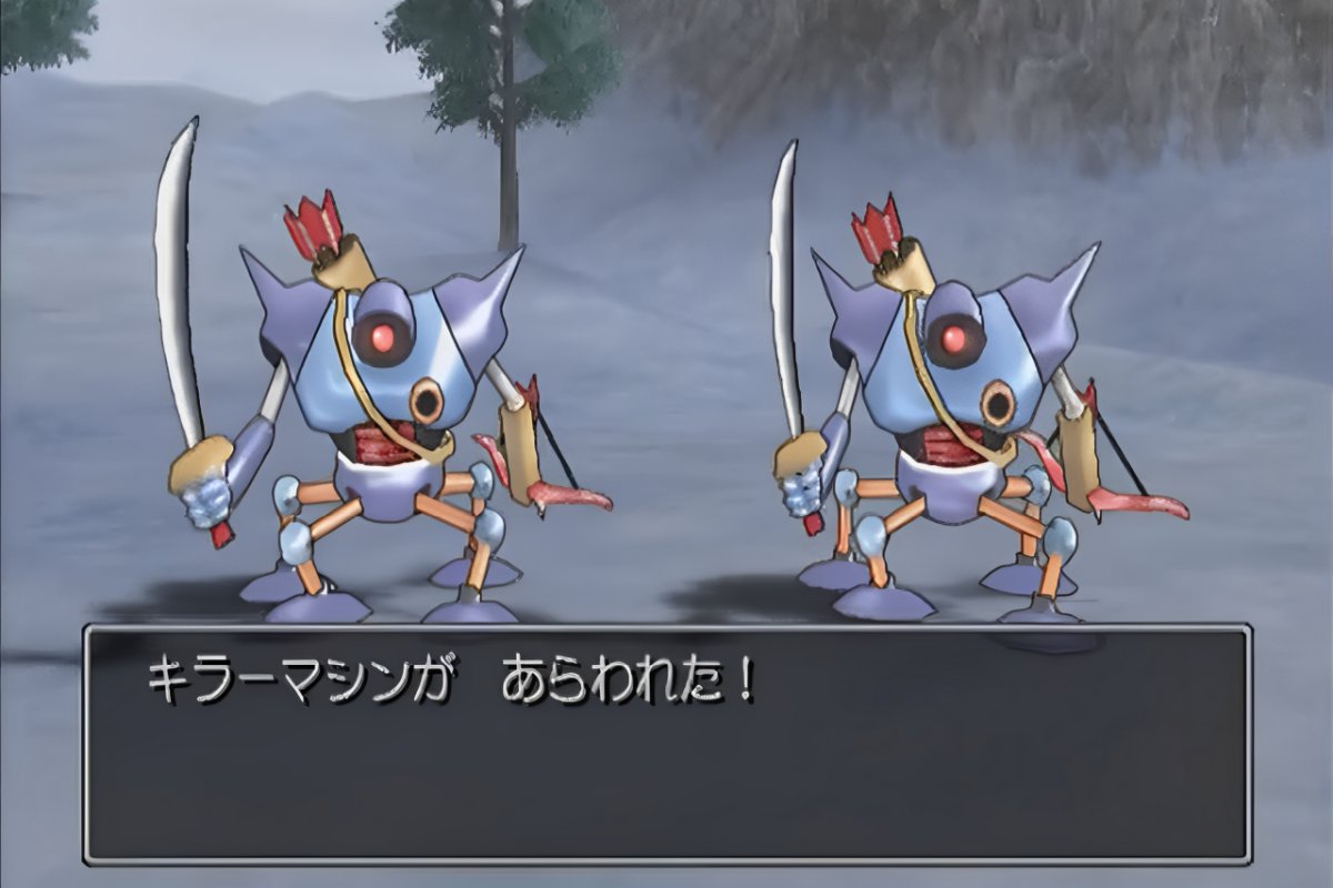…そして。ドラクエシリーズで雪原というと、『8』までシリーズが進んでも、『2』のロンダルキアが印象的ということのためか、有名モンスターの「キラーマシン」が登場する。DQ2では、ロンダルキアの洞窟で初登場した強敵であり、そのバトル的な強さと、「なんでドラクエに機械があんだよ…」というインパクトが大きかったためか、その後のシリーズでも定番の敵となった。雪山で登場するのは、その『2』を彷彿とさせる演出である。