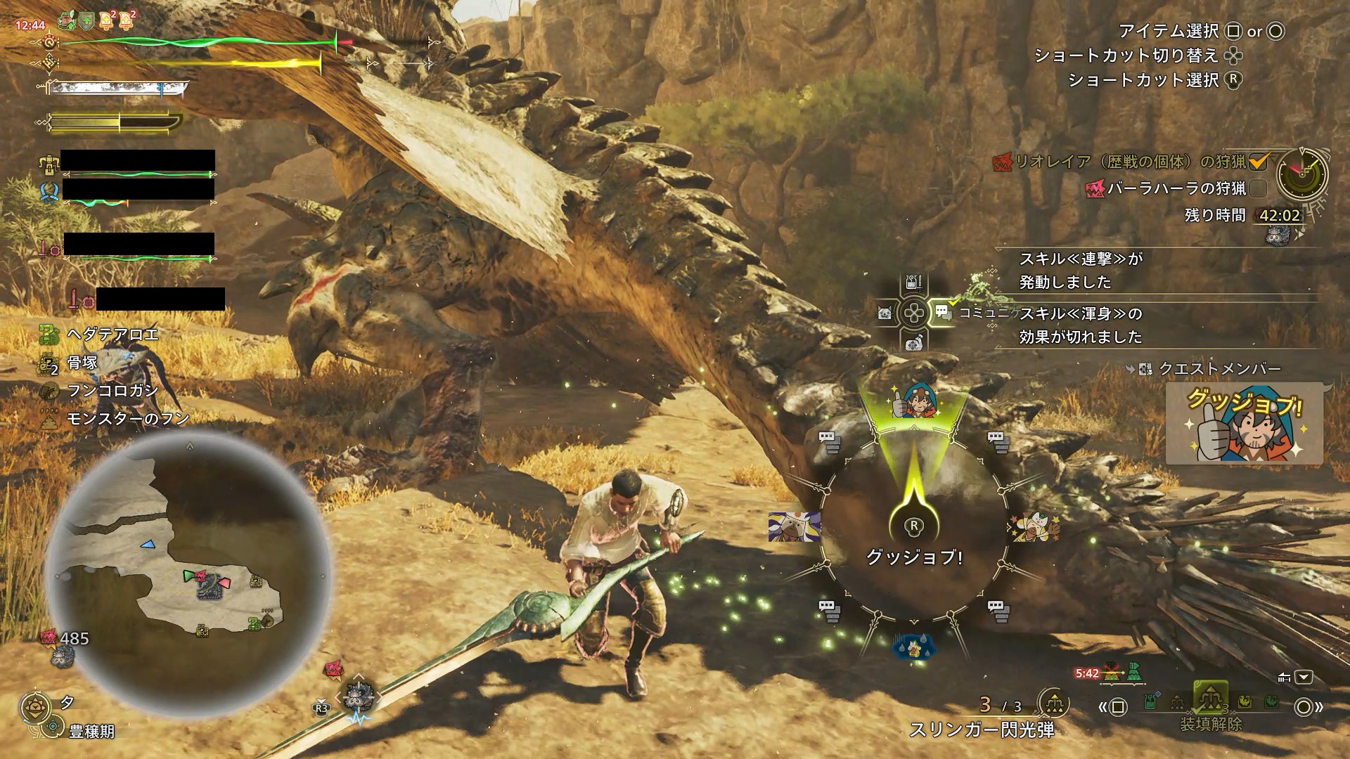 …というのも、『サンブレイク』も部分的にそうだったが、『ワイルズ』では、初期バージョンのゲーム開始直後から、オフラインであっても、NPCの仲間3人を連れて、計4人での狩りが可能である。NPCは戦力として優秀かつ、サンブレイクほどではないものの、なかなか個性的なキャラ付けになっている。そのNPCキャラを呼び寄せる「救難信号」を、クエスト開始と同時に打ち上げる便利機能も存在する。以上のような理由により、PSplusに加入しなくとも、共闘プレイを楽しめるようになっているのだ。