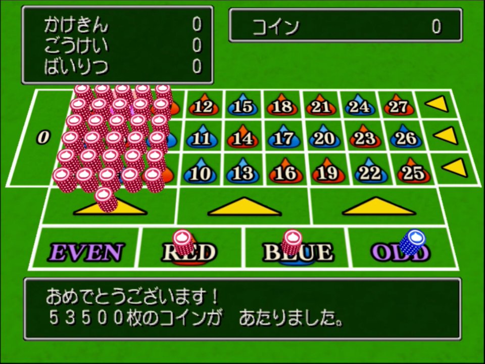 というわけで。そのどこでもセーブを使って、ルーレットにて「外れたらリセット、当たったらすぐ中断セーブ」を繰り返し、コインを増やしていく。序盤こそ枚数がショボいものの、所持コインが5桁に達する頃になると、左側にドサッと1万5000枚ほど積むやり方で、最大7万枚という当たりを簡単に引けるようになる。もしこれが現実なら、レバレッジ3兆倍とか賭けて、一瞬で仕事を辞められるのだが…。