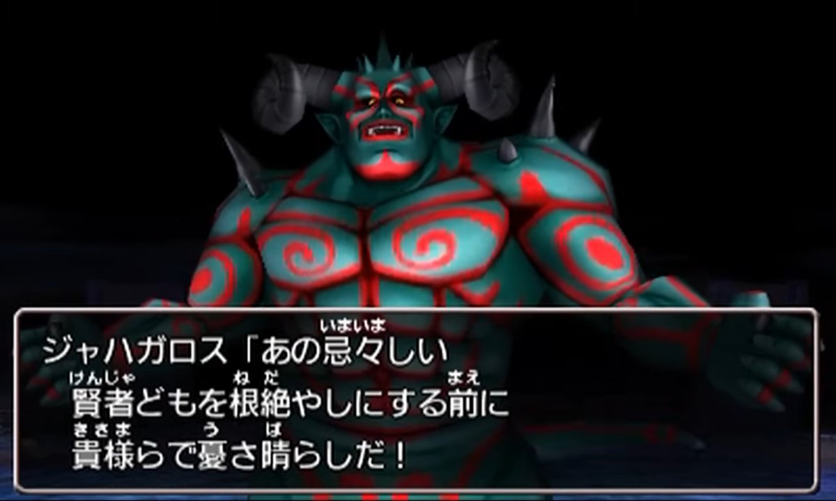 さて。最深部では、ボスの「ジャハガロス」が登場する。暗黒神ラプソーンの部下の一人であるが、これまでは賢者たちによって石化されていたが、そこから復活を遂げた。と書くと、賢者の末裔が死んだことによって封印が解けたように思えるが、どうやら偶然このタイミングで蘇っただけということらしい。あれだな、FF13の2章の、ライトニング&サッズのシーンで、ライトニングが祈ったから遺跡の扉が開いたように思えるが、「実はスノウが中でボタンを押していただけ」という設定に似ている。