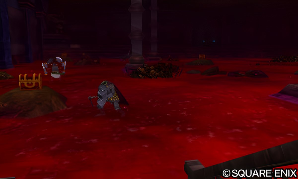 次に、「奈落の祭壇」注目点そのAは、第2フロアの毒沼エリアである。だだっ広い毒沼は、血のように真っ赤な色をしており、一定時間ごとに、通常の5倍である5ダメージを受ける。これくらいになると、さすがにゲーム終盤程度のHP水準であっても痛い。FFシリーズにおけるレビテトのようなダメージ無効手段は無いため、一定時間ごとに回復をしていく必要がある。