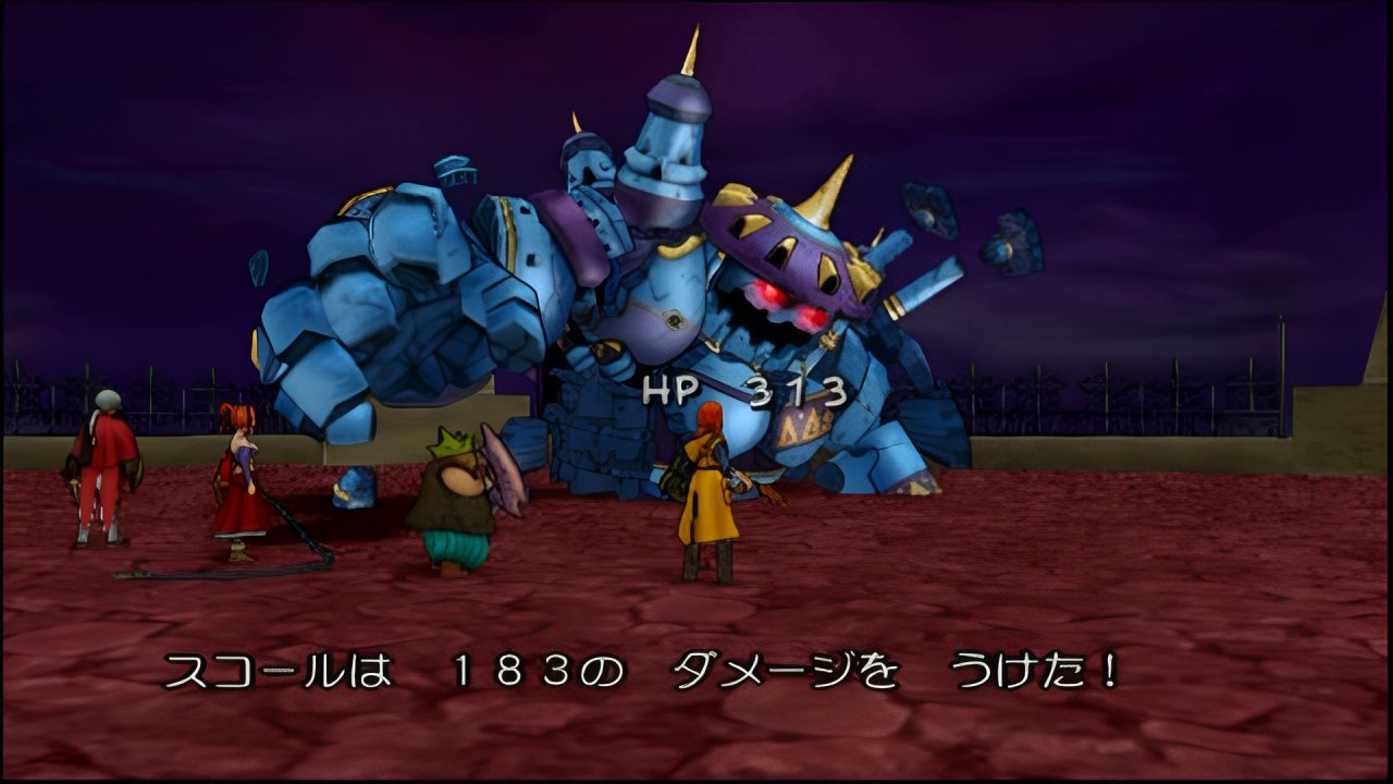 ――ちなみに、この敵で最も印象に残るのは、グラフィック詐称である。登場シーンでは、“城の破片が集まって魔物化し、まず、巨大な手だけが現れて、空中の瓦礫を握り潰す。その後、本体が眼下からグググッと現れる”という、迫力の演出が為される。が、実際のバトルが始まってみると、サイズが小さくなっているどころか、地面に埋まってしまっている。“巨大な敵と戦う”という演出をやろうと思ったが、すぐ後の本編ラスボス戦と被ることに気付き、恐らく制作も終盤ということで、力尽きてやめたのだろう。もし、いつかDQ8のフルリメイクが為されるなら、壮大な戦いが展開される…かもしれない。