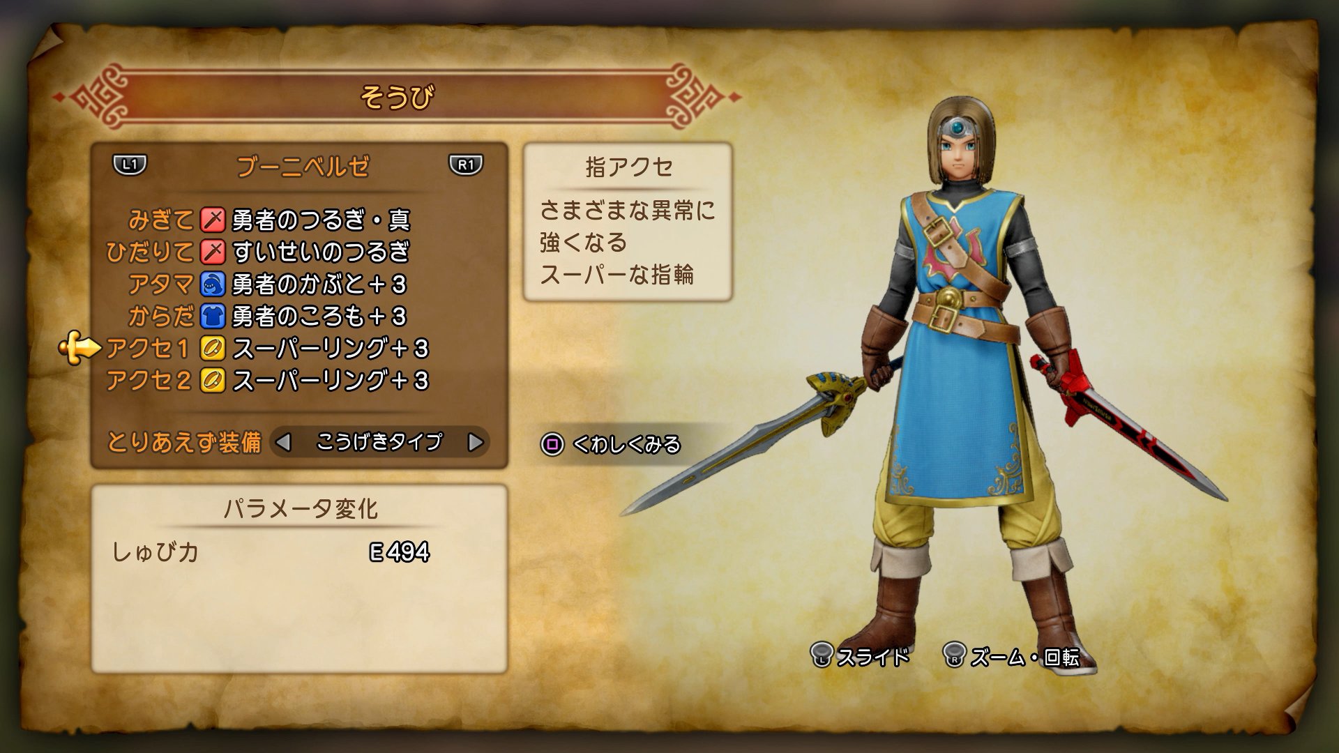 しかしながら、では「装飾品」枠に強力な対抗馬が居るかというと、そういうわけでもない。パラメーターUP系は、激レア品の「ほしふる腕輪」(素早さ+50)が何とか使えるという程度だ。また、3DS版では、配信限定で「属性呪文の無効化」「被ダメージ3/4」「みかわし率1/8」などと、かなり強力な装飾品が用意された。これらは、ガチのマジで配信限定であり、その手段・期間が終了した現在となっては、一切の入手方法が無い。温泉智絵里というやつである。これらの装飾品は、通常攻略で役立つことはもちろん、特殊な縛りプレイの幅を広げてくれるものでもあったため、手に入らないのは非常に残念だ。