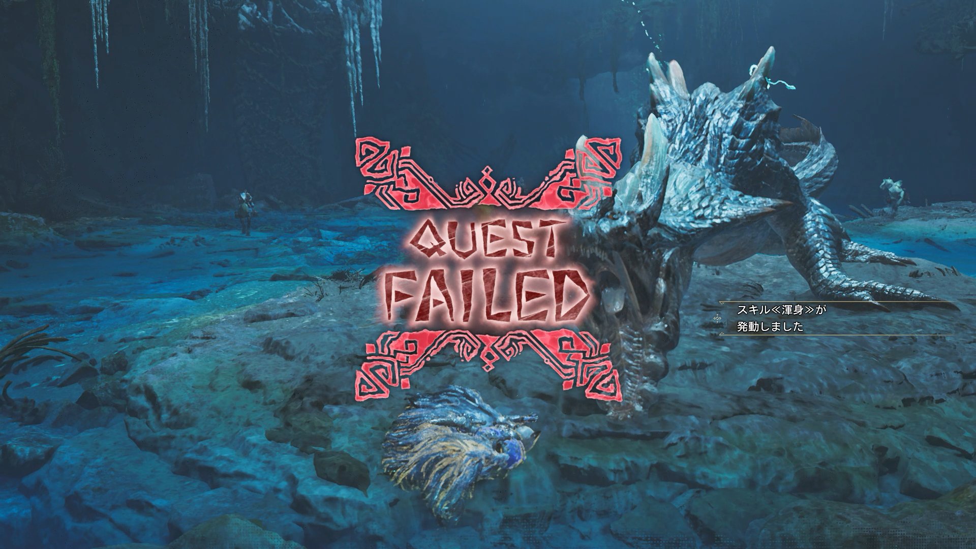 ――しかも、強力な歴戦個体を相手どった場合であっても、この水中戦は存在する。そして、いつもと違った戦闘形式に加えて、歴戦★8の高火力も相まって、割とバタバタ死者が出て、普通にクエスト失敗になる。こういう、“普段と違う操作性のところが難しい”のは、ミニゲームにトロコンを阻止されるといった感じで、特有の不快感があるな…。