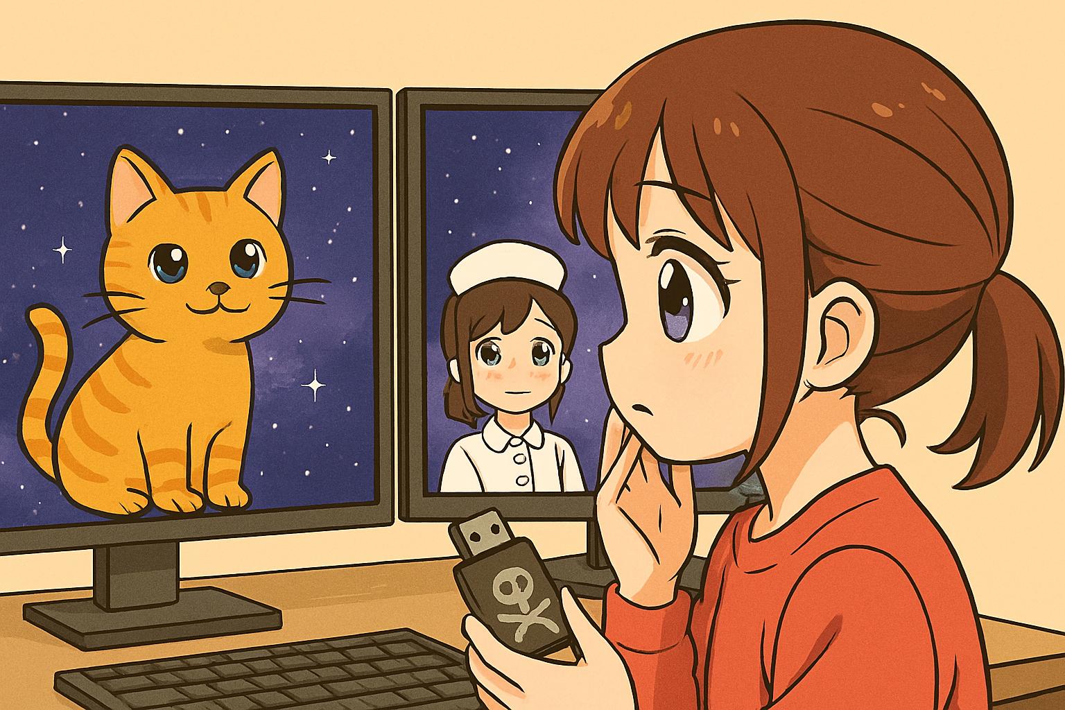 というわけで。この☠毒メモリ☠については、私は使うつもりは無い。買ったばかりのメインPCに差すなんて、もってのほかであり、使うとすれば、“捨てる直前のPC”をオンラインから遮断したうえで遊び全部で繋いでみるか、それすら面倒なら、そのままゴミ箱(物理)へ、ポイだ。この手の物は、フォーマットしても必ずしも安全になるとは言えないらしい。そもそも、今はUSBストレージに困っていないということもある…。
