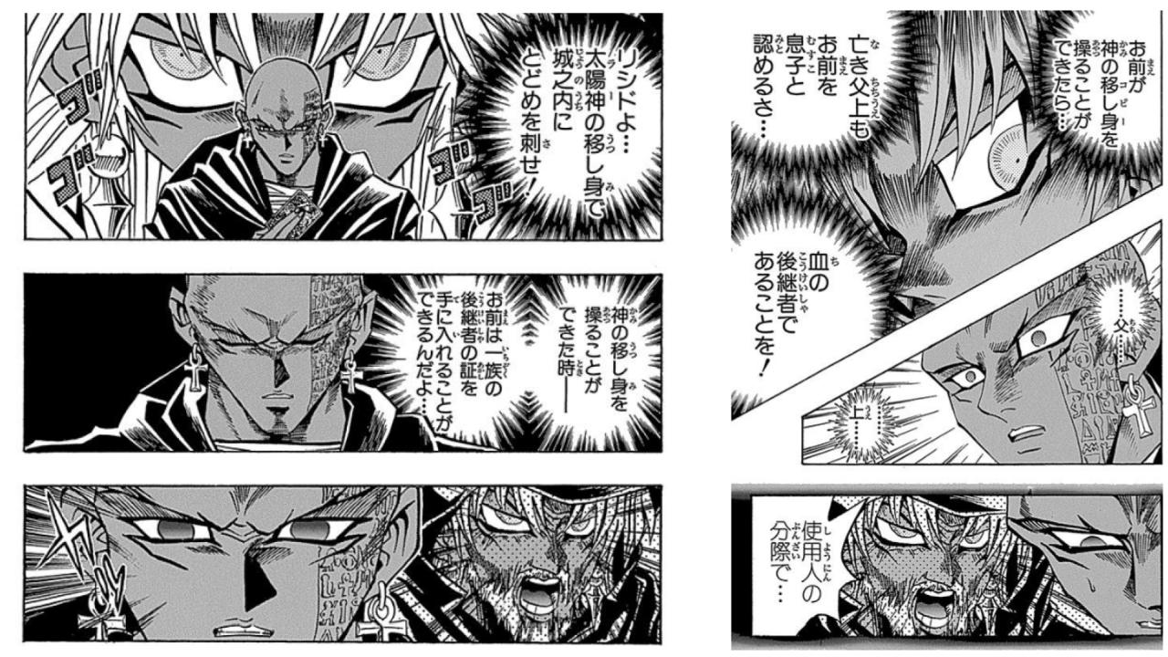 …ところで、リシドというと、今でも思い出すのが、バトルシティ編のシリーズボス:マリクによる、華麗な論点のすり替えである。元々、マリクとリシドは、「墓守の一族」であるが、正式な兄弟や師弟などではなく、捨て子としてリシドが拾われてきた。その点で、血統にこだわるマリクの父親(故人)に激しく叱責されたことをトラウマに思っており、リシドには「本当の家族として認められたい」という思いが存在している。