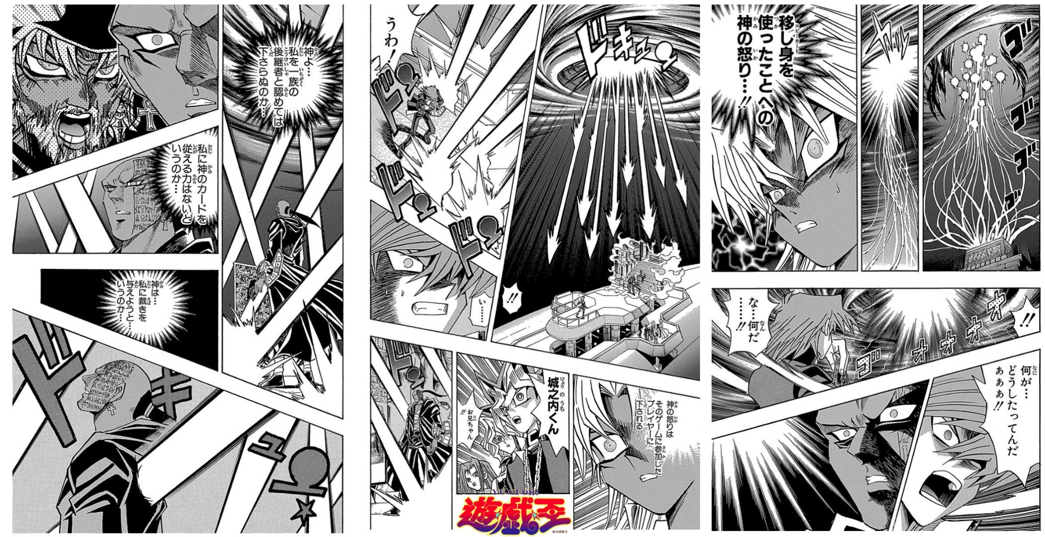 さて。作中のデュエルでは、リシドが得意の罠カードを使った戦術で、城之内を事実上の敗北にまで追い込んだ。しかしながら、リシドの目的はマリクの影武者となることであり、そのために、既に勝利したデュエルで、あえて神のカードを召喚するというオーバーキルを行おうとした。しかし、それがラーの複製カードであったため、本物のラーの怒りを買い、デュエルしていた2名に天罰が下る…という流れだ。