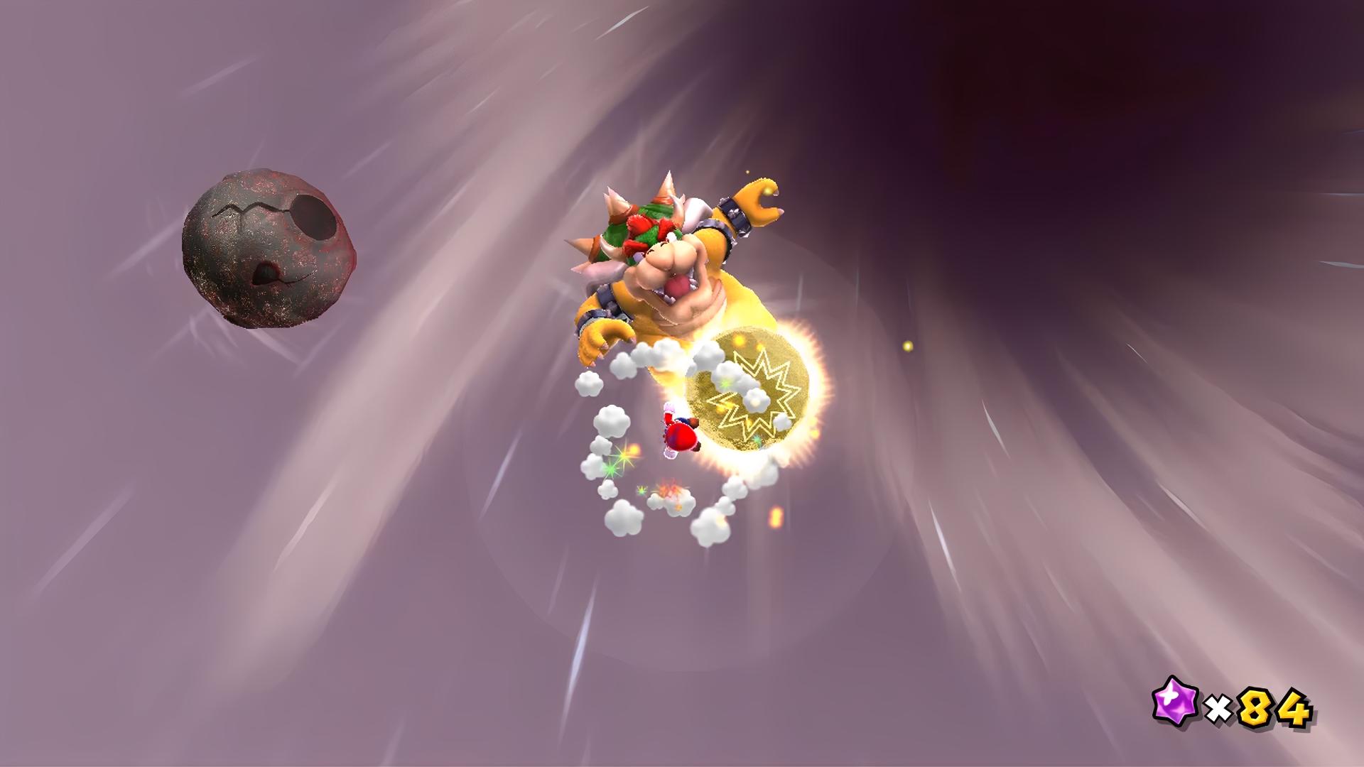 …しかしながら、予想に反していたのは、何故か異様に簡単ということである。銀河の海を流れる中、奥から巨大化したクッパが攻撃を仕掛けてくる…という内容なのだが、適当にやっているだけでも全く命中しない。そして、これまで通り、ヒップドロップで隕石を飛ばして攻撃していくのだが、その隕石が向こうから吸い付いてきてくれるため、攻撃チャンスを図る必要すらない。初見で、何の抵抗も感じることなく、あっさりとノーダメージ勝利に成功してしまった。