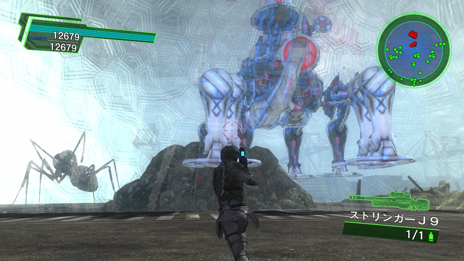 続いては、ガラッと方向性を変えて、地球防衛軍シリーズで、よく議論の種となるゲームデザインについて触れてみよう。本ミッションは、ディロイを投下する輸送船が2隻と、そして黒蟻巣・赤蟻巣が1個ずつ存在し、それらをヘクトルが護衛しているという、それだけの内容だ。味方は存在しないものの、強化された「ストリンガーJ9」を使い、まずは増援ポイントを狙って、敵を削っていけば良い。