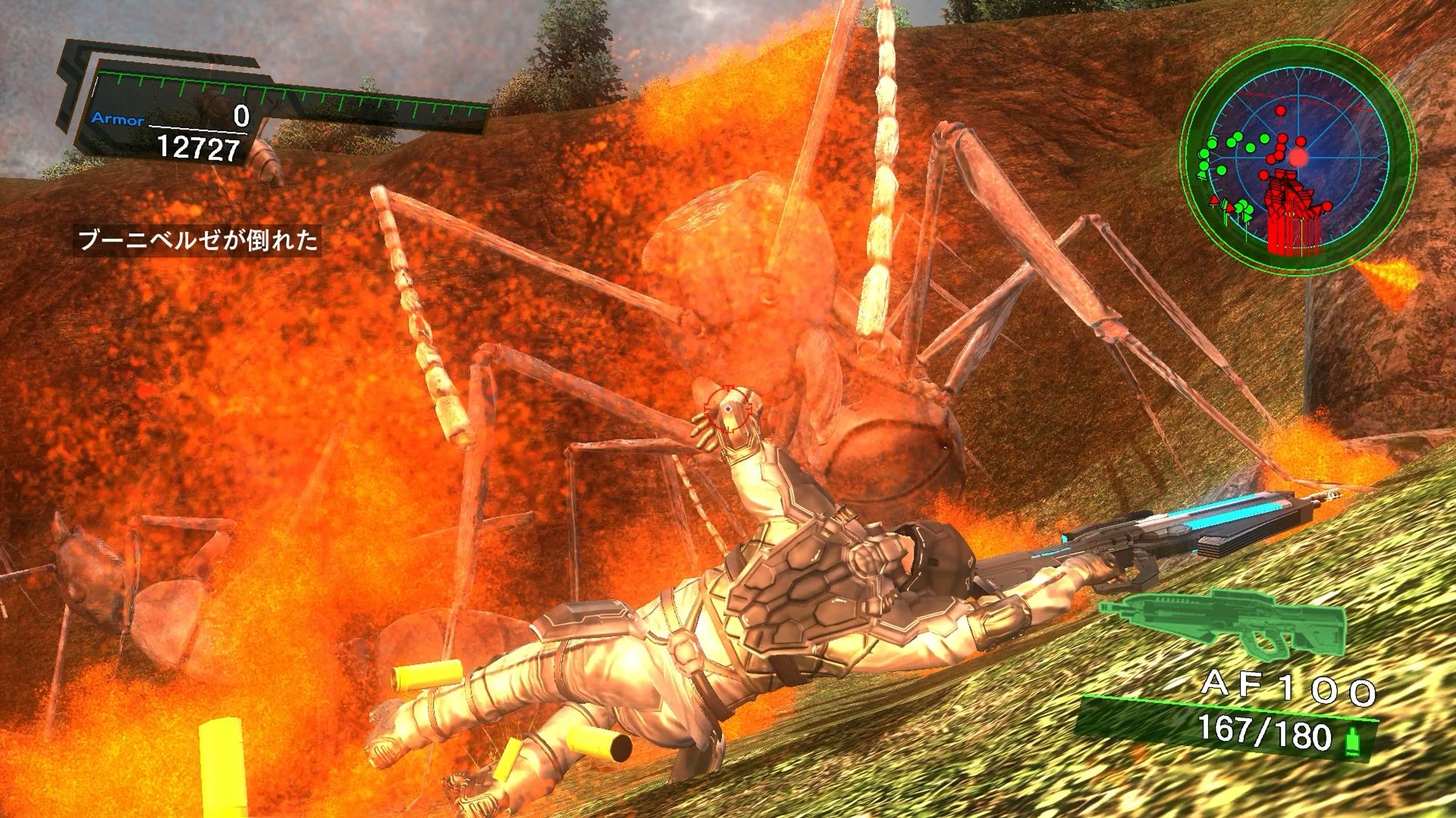 というわけで。下位難易度と同じく、今回も爆発物を片手にミッションへと挑む。「スティングレイMF」を使い、出てきた蜘蛛を巣ごと攻撃していけば、相手の大規模な拡散は防げる。もっとも、そのままドカンドカン吹き飛ばしているだけだと、ダメージ効率は良くない。しかしながら、「蜘蛛40体の補充間隔」は長いので、途中はAF100で射撃をして良い。やり込みプレイのように、わざわざ時間を数えなくとも、蜘蛛の頭が見えてから爆発物に切り替えれば十分だ。数体をのがしたところで、初期体力プレイでもない限り、それで仕留められることは無いであろう。
