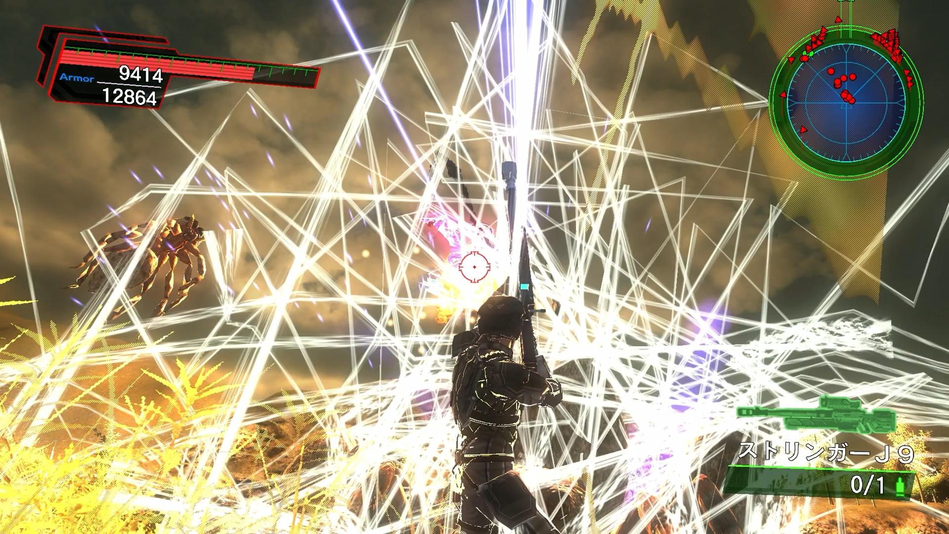 というところなのだが、それを最悪な手段で邪魔してくるのが、前述のヴァリアント・レタリウスである。原種の時点で地球防衛軍を代表する害悪モンスターであったが、このミッションではレタリウスの嫌なところが大結集している。まず、ただでさえ時間との戦いなミッションなのに、レタリウスの糸に引っかかると、自由な移動ができなくなる。このミッションでは、四方八方から糸が投げつけられ、ハッキリ言って能動的な回避は不可能だ。“既に何かの糸に引き寄せられていると、他の糸には引っかからない”という操作系理論によって、いい感じの位置に居る相手に引っ張ってもらうことを祈るしかない。