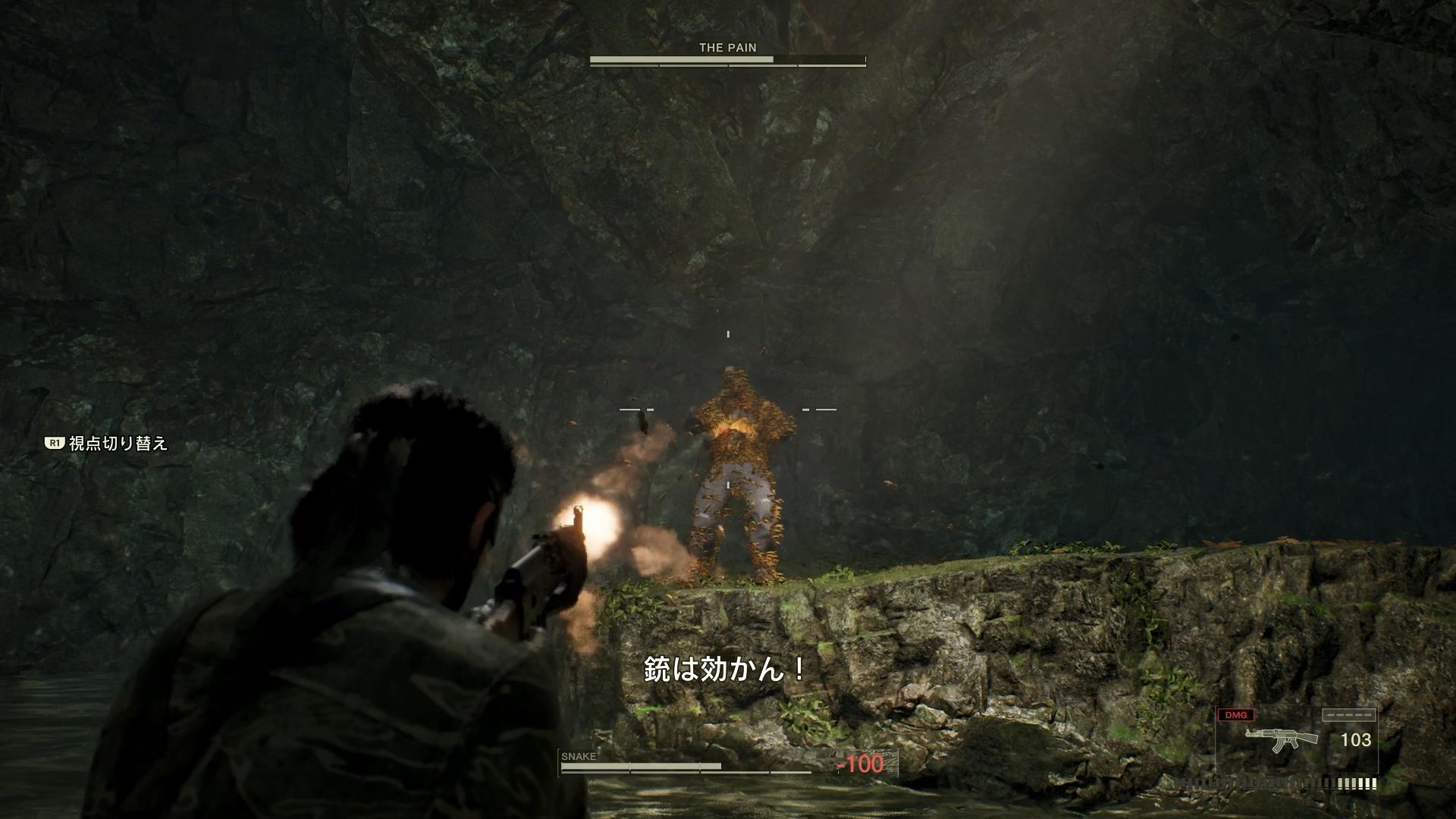 …の前に、MAPの右側を走り、寄り道ルートへと進んでおく。ここでは、マシンガン系の武器である「M63」が手に入る。率直に言って、このゲームの戦闘において、そこまでの火力が必要になる場面は無い。“潜入任務だから”とか、そういうことではなく、ボスには無敵時間があるので、AKで十分なのだ。しかしながら、腰だめでの射撃中、スネークが「うおおおああぁぁぁぁ!!」と咆哮してくれるのは、何と言うか、凄く来るものがある。せっかくスタッフが頑張って作ってくれた寄り道地帯なのだから、しっかり味わっておこう。