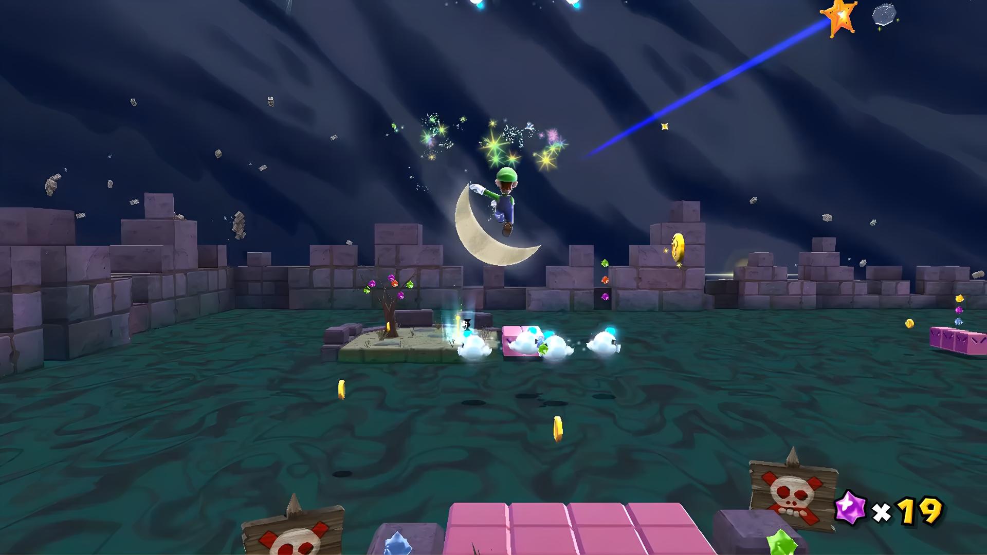 ★1,2:地獄リゾート「マリオサンシャイン」からの復刻ステージだが、そもそも「ギャラクシー」のほうが操作が軽快なうえ、落下対策の雲まで使える。そして、緑スターは、2つとも開始時のムービーで見えている。マジで何のためにこのステージを出したのか分からん。