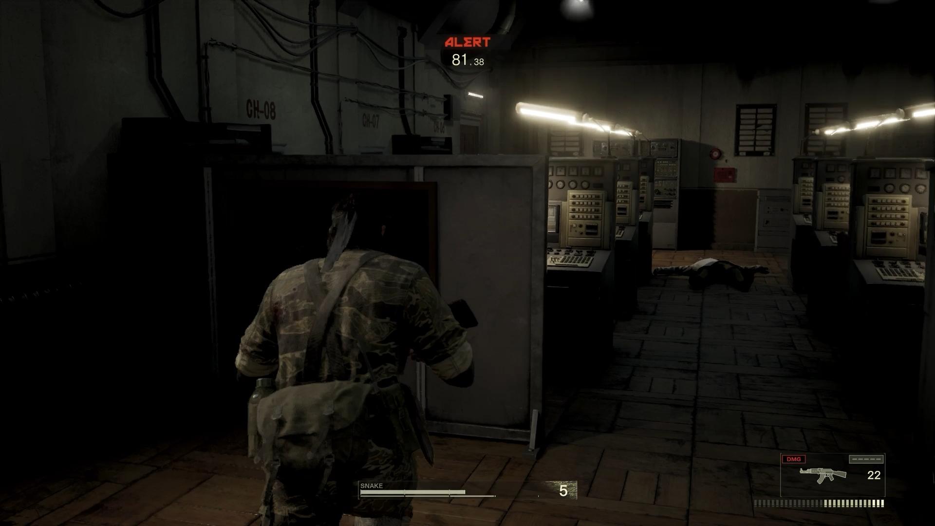 そして、この研究所では、『メタルギアソリッド3』という原作ゲームが持つ、どうしようもない古臭さを体感せざるを得なかった。どういうことかと言うと、マップが異様に狭苦しいのだ。廊下はまだマシなほうだが、各種の部屋の中が異様に狭く、銃は近接戦闘になるし、走るとすぐに壁に当たる。顕著なのが、パソコンの進化前のような機械机が何個も置かれた部屋であり、カメラが引っかかって尋常ではない窮屈さだ。グラフィックだけはしっかりPS5世代なのに、マップデザインがPS2の、しかも固定カメラ時代を前提として作られている。やはり、PS2時代も既に20年前であり、その時代のゲームは、もはや現代では通用しないのだ。