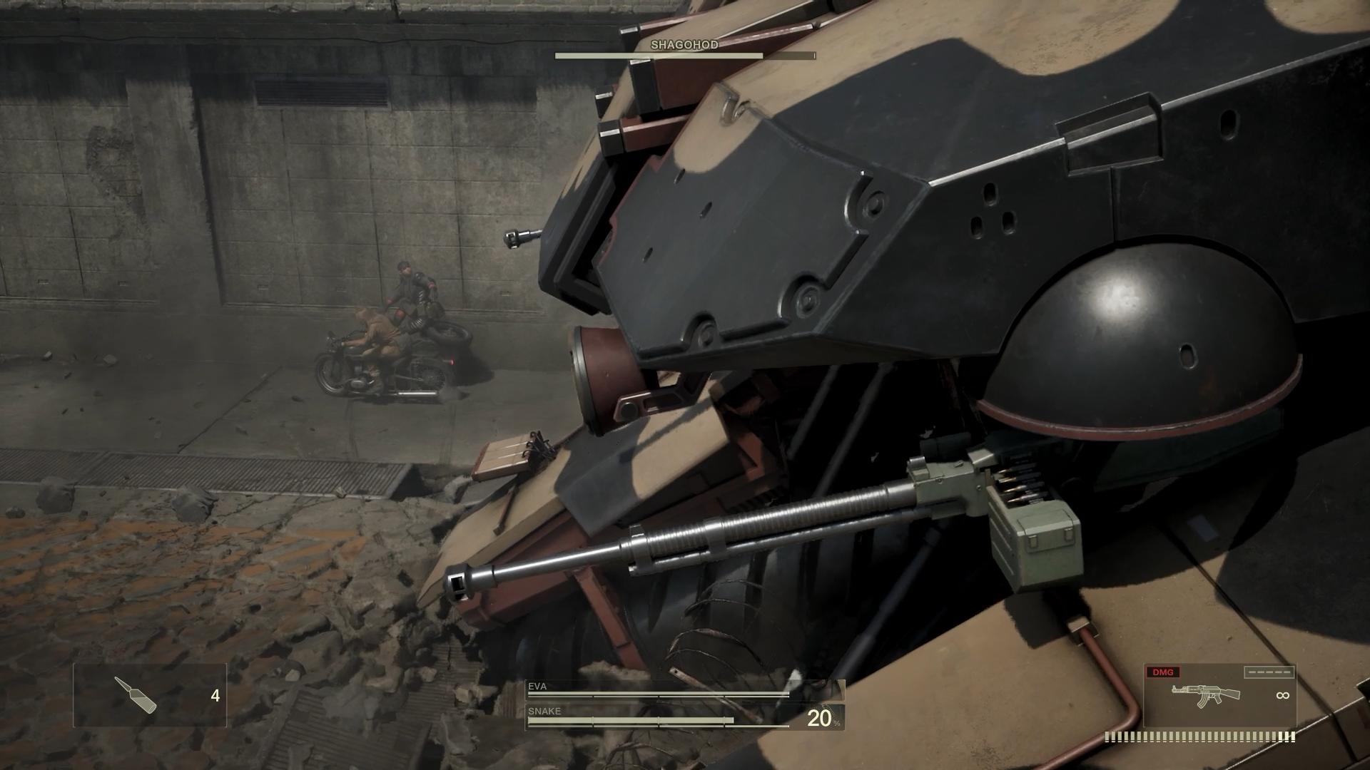 ヴォルギンの撃破後は、EVAと共にサイドカー型のバイクに乗って、銃撃戦をしながら、グロズニィグラードから脱出するシーンとなる。不思議な力で弾数が無限になっているなど、緻密なゲーム性のMGSにそぐわない感はあるが、まあ映画に恒例の激しいアクションシーンをゲームに取り込んだというイベントだ。どれくらい恒例かというと、事実上の初作と言える『MGS1』でも、ラスボス撃破後の脱出シーンが、よく似たカーチェイスであった。
