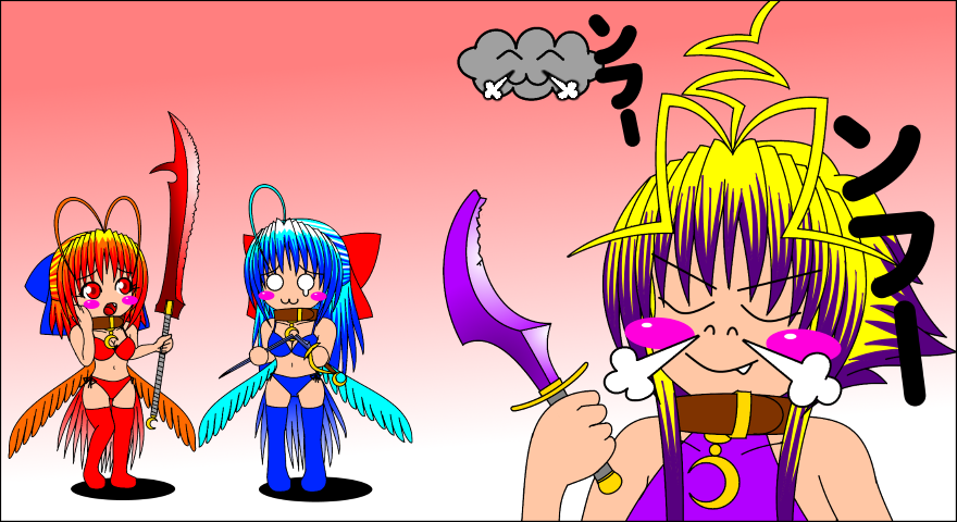 そして三女トモ。彼女も同じく、サンダーバードという種族特性の地力があるので、実はかなりの実力者である。欠点らしい欠点はない。おどけたキャラクターで描いているのでだまされるのだが、能ある鷹は爪を隠すんですよ。イエ〜。 (←???)