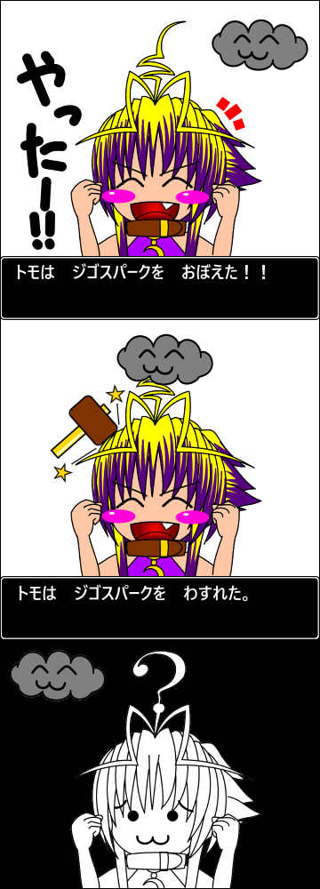 この間にユエの性格は「おひとよし」から「らくてんか」 に、トモは「こうかつ」から「がんこもの」 に。ルナは「だいたんふてき」 のままである。相変わらず性格に関してはなんか……面白いんですよね。本当に意識していじっているわけではないんですが…。