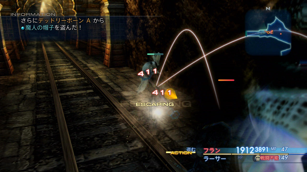――ちなみに、以降の基本戦略としては、回避率の高いパンネロに「デコイ」を使って盾役とし、後ろからヴァン・アーシェが魔法で攻撃するか、またはバルフレアが銃撃を行う。パンネロの回避率は、この時点においても合計7割近くとなり(FF12の回避は盾→武器→アクセサリの順番に判定)、HPも高いため、かなりの強敵相手であっても戦っていくことができるのだ。雑魚もボスも、基本的にはこの布陣でOKである。バッシュは、銃や魔法が効きづらい相手への物理攻撃役として、状況に合わせて使用する。フランは…うん!