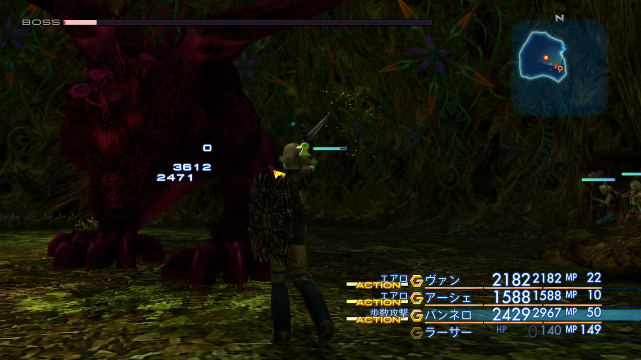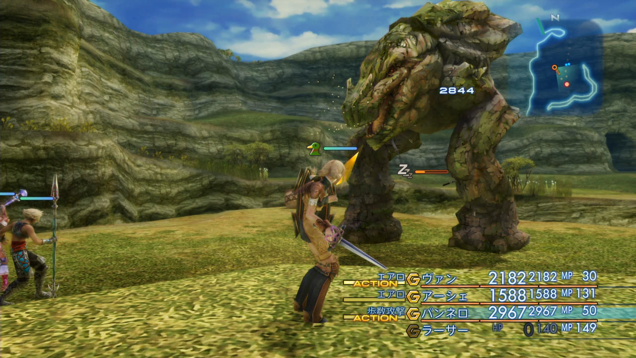 …続けて、オズモーネ平原に南下し、「エンケドラス」の討伐に向かう。周りのザコを適当にエアロで吹き飛ばしていき、本丸との戦闘を開始する。が、こいつにも睡眠が効いてしまうため、眠らせて弱点の「エアロ」で攻撃するだけで終わった。うーん、2ジョブ目が解禁されたことで確かにFF12らしい戦いができるようになったんだが、これはこれでワンパターンという気がしないわけでもない…。