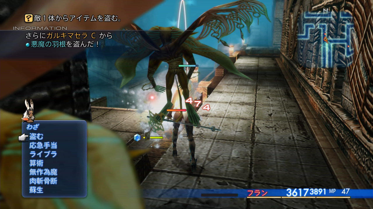 ――さて。ガルキマセラの出現場所は、ラバナスタ・ダウンタウンからガラムサイズ水路に入ってすぐ左(地図上で)の場所なのだが、面倒なことに排水をしているとグレートキングなど他の敵が出るが、注水をしていると近付けないという特性があるため、右側を排水し、ぐるりと回ってオイヨイヨスポットを通って出現場所まで行かなければならない。まあ、その付近には、2エリアチェンジが簡単にできる場所とセーブクリスタルもある(その更に先は、ヴァンが序盤にラバナスタ王宮に忍び込む際に使ったエリアに繋がっている)ため、「盗賊のカフス」を装備して時間さえ掛ければ、盗むの実行はそこまで難しくない。なお、後にPS4版から新規追加されたオートセーブ機能を使えば実はかなり楽に稼ぎを終わらせられることが発覚したのであるが、それはまた次回以降の話である。