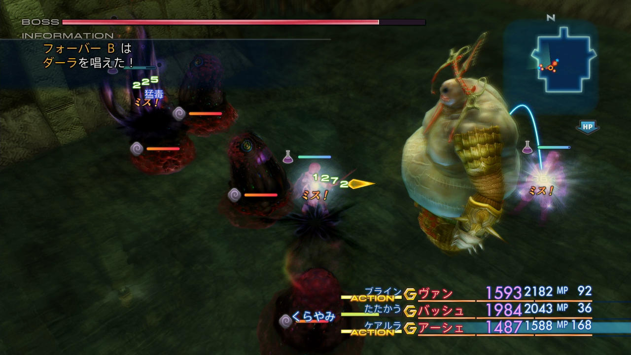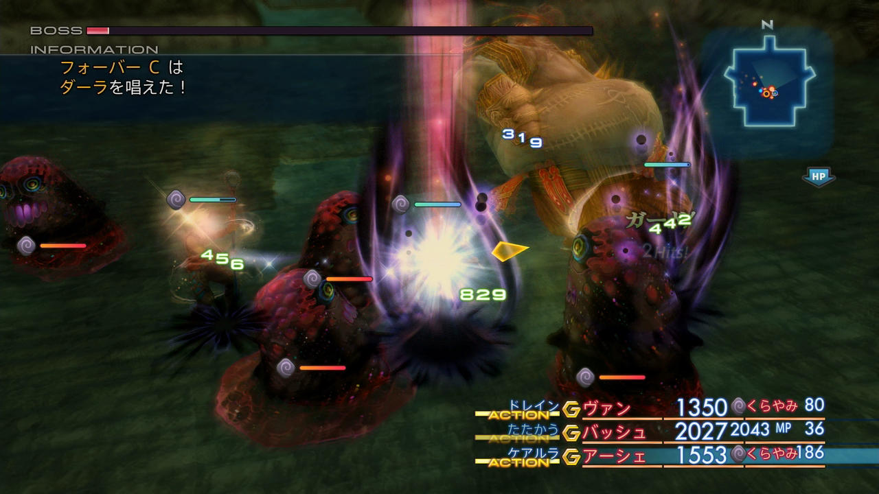 ちなみに、ここまで説明してこなかった敵の攻撃であるが、まずはキュクレイン&フォーバーの主力と言えるステータス攻撃に関しては、上記のガンビットで回復したり回復しなかったりする。治療の優先度が高いステータスは、睡眠状態とバッシュに対するスロウ・暗闇状態、逆に優先度が低いのは猛毒状態やヴァン・アーシェに対するスロウであり、それぞれ上記のガンビットのような優先順位で回復をしていく。なお、INT/PS4版の「クロノスの涙」は、ストップだけでなくスロウ状態も治療できるアイテムとなっている。なお、「バイオ」の追加効果で発生するスリップは、1秒間につき10ダメージとパーティ側のキャラにとってはなかなかのダメージとなるのだが、ヴァンとバッシュの「万能薬」かアーシェの「エスナ」でしか治療できないので無視である。まあ、異常空間のダメージの一部としても丸め込める範囲である。