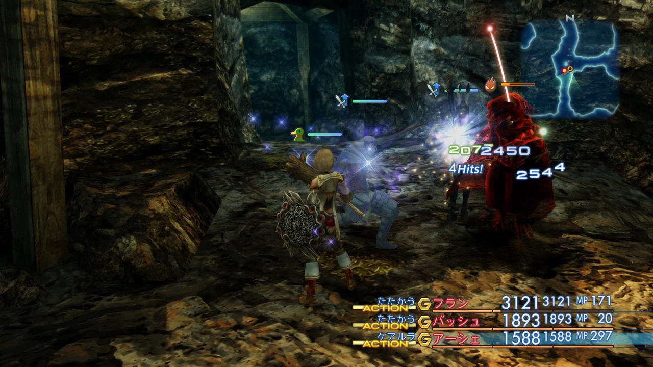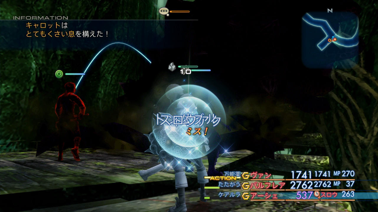 そんなわけで。ラストは、近接していたヴァンとアーシェの両方が「とてもくさい息」を喰らってしまい、残ったバルフレアはバーサク状態という全滅まっしぐらの状況に陥ってしまったのだが、その時点で敵のHPは残り僅かであったため、そのままバルフレアが銃撃で撃破をすることに成功した。ちなみにカロリーヌはバトル前段階の邪魔な雑魚敵を全滅させるパートでフランと共に散りました。