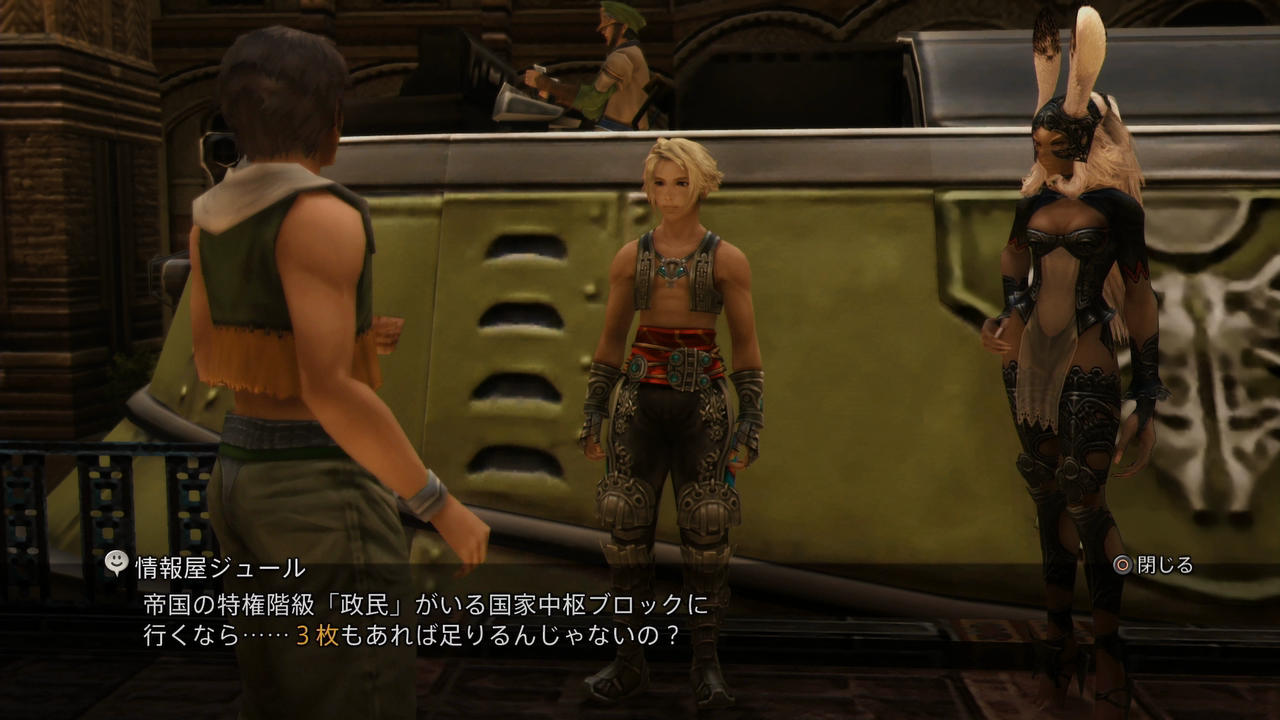 さて。ここでは、物語を進めるために「情報を人から人に伝えてリーフを獲得する」という、FF12プレイヤーにはお馴染みのイニシエーションがあるが、なんと今回PS4版では、シナリオを進めるために最低限必要な枚数が9枚から3枚へと減っている。INT版でも9枚のままだった(はず)ので、この調整はPS4版での完全新規仕様ということになる。よほど不評だったのであろうか…。