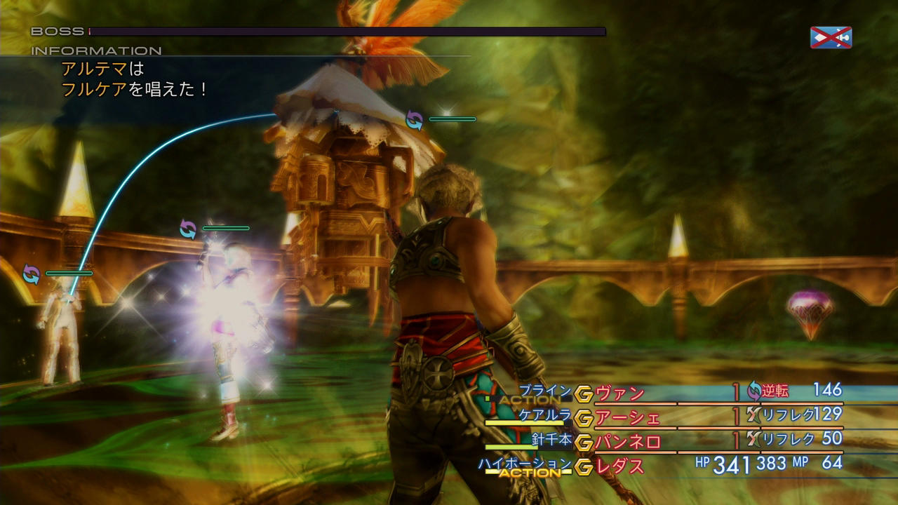 …まず、今回はレダスを投入するという致命的なミス「デコイ」の掛かった盾役が聖属性を吸収するという構造的欠陥を抱えているため、アルテマが不定期で強化された状態とそうでない状態を行き来してしまう。その内容としては、「通常攻撃CT0を得る」「ホーリジャで逆転状態になった対象にフルケア・ケアルガを使う」の他、「HP<50%となった後に『リフレガ』をこちら側に使用する」というものである。このうち「リフレガ」に関しては、味方への魔法が反射されてしまうと致命的な事態に陥りかねないため、回復とサポートを担当するアーシェは「オパールの指輪」を装備してリフレク貫通の効果を得ていく。なお、「デコイ」に関してはINT版からリフレクで反射されなくなったため、ヴァンも含めてそのまま使っていけば大丈夫である。