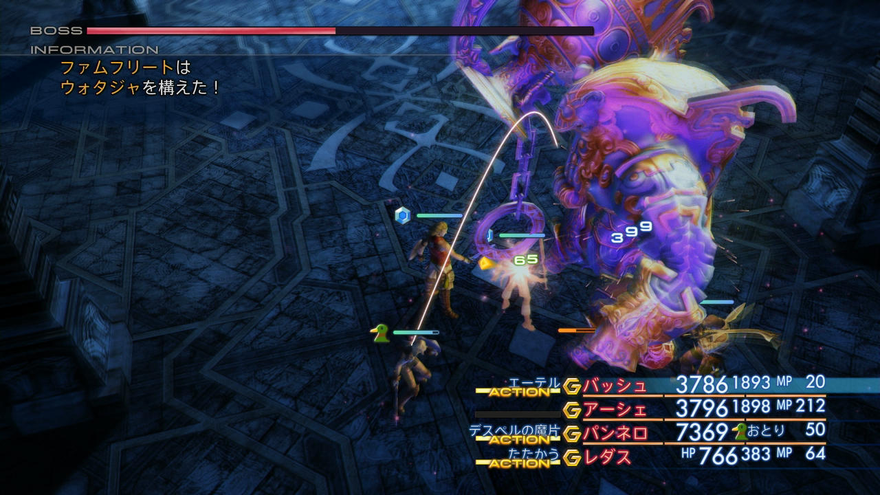 - メテオライト(A)」という、INT版/PS4で追加されたもの同士を使ったガンビットを挟み込み、自分をスリップ状態にすれば良いのだが、「メテオライト(A)」は大量入手がかなり面倒なアイテムである。また、バッシュが「バヒール」をレダスに使おうにも、やはり敵の存在状態に分けて使い分けるのがとても難しい。この辺りは、「聖に弱い敵」「HP<50%の敵」「敵2体以上で敵に」などを組み合わせれば何とかなりそうであるが、最終的に1時間以上考えてもどうにもならなかったため、潔くバヒールを諦め、バーサク状態のON/OFFのみで戦っていくことにした。