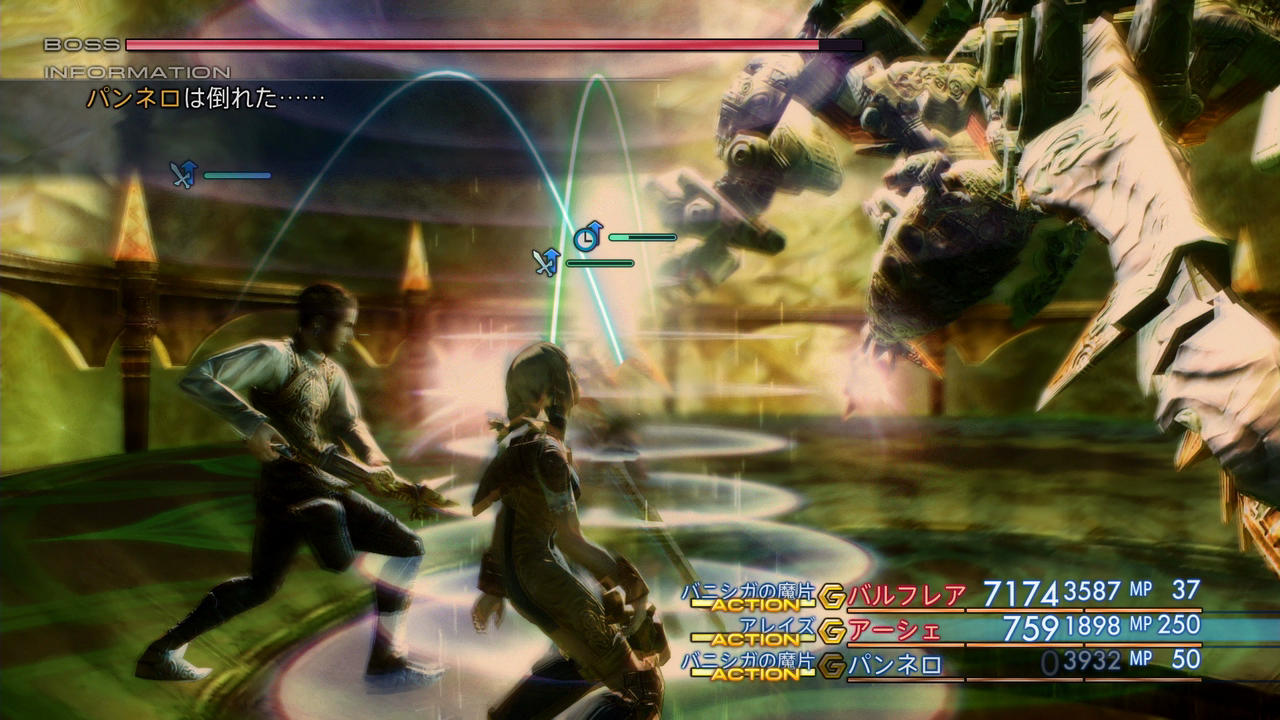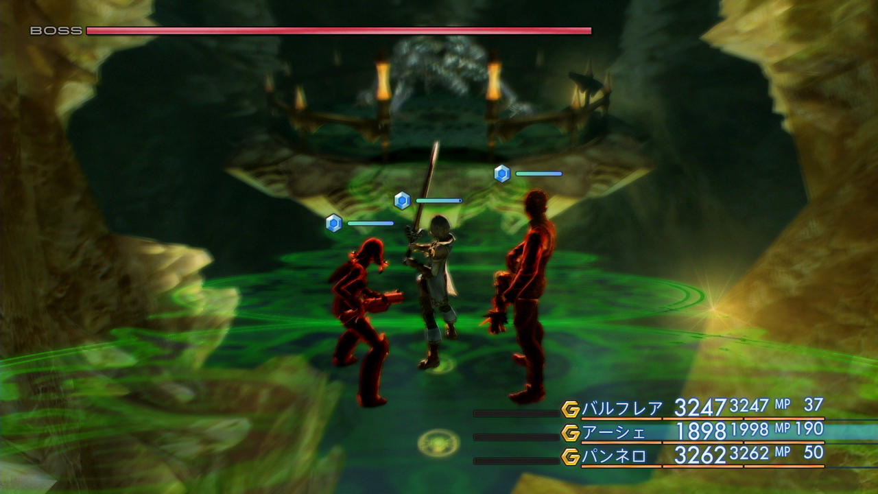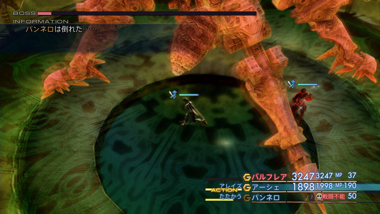 ――さて、そうやって敵の攻撃が10000ものダメージを叩き出すようになると、全ての攻撃で確実に一撃死するため、FF12の基本システムである「敵が通常攻撃CT0を得て、かつこちらが敵の攻撃で毎回倒される場合、戦線を維持することができない」という状況に当てはまり、戦闘の続行が不可能となる。一応、敵がこちらを感知するまでのタイミングにはムラがあり、運良く「たたかう」が入ることもあるのだが、すると今度は蘇生のほうのタイミングが崩れてしまい、2回連続で攻撃をされて全滅してしまうことがある。実戦でも、敵が瀕死状態になって少し経ったところで、バルフレアが「たたかう」をしている最中にアーシェが狙われて死亡、バルフレアはアーシェに「レイズ」を使ったが、敵の攻撃のほうが早く、そのまま全滅するに至ってしまった。瀕死まで行けるなら勝てそう!