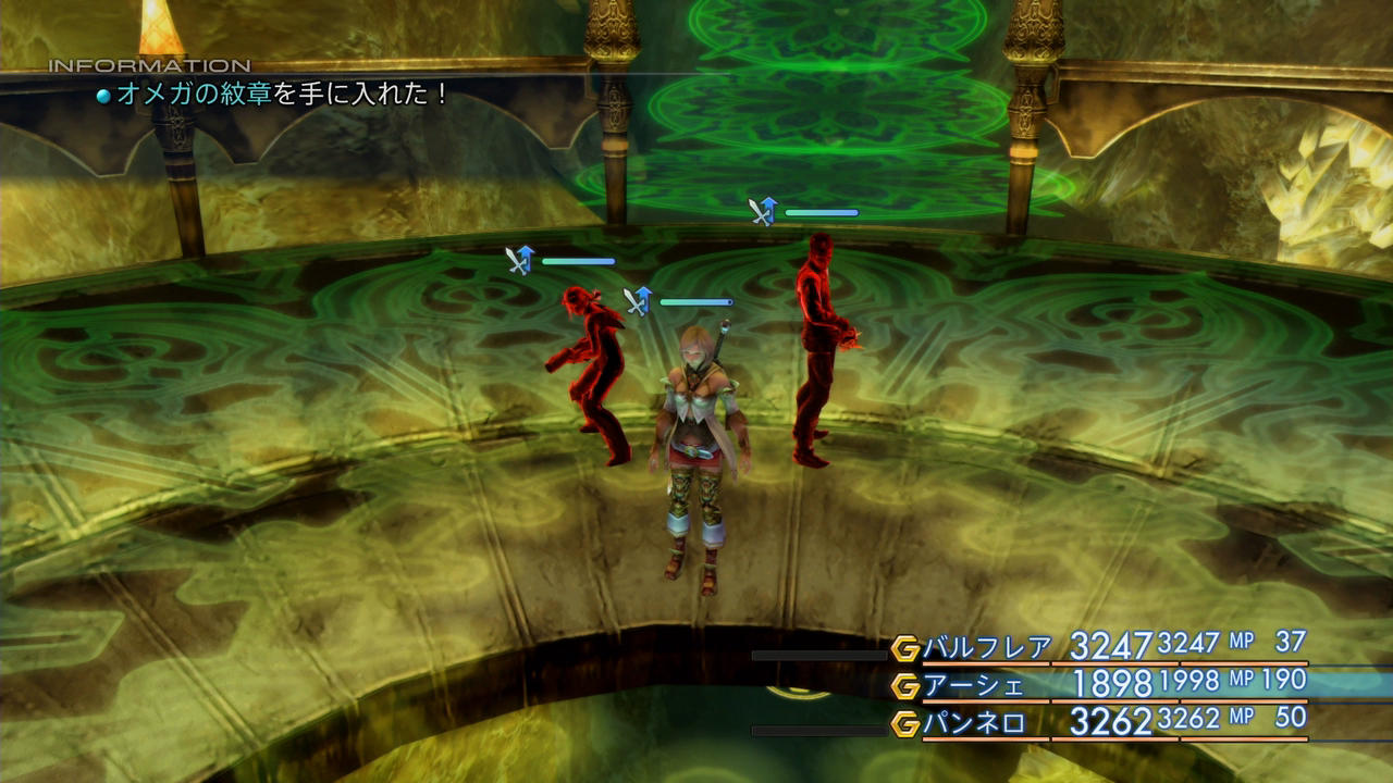 …と思ったのだが。この方法だと、アーシェが「レイズ」で味方を蘇生させるタイミングと、オメガが回転動作するタイミングが完全に被ってしまい、上手く回り込めずに発見されてしまう事態が頻発する。何度かやってみたが、どうにもこの問題は解決できそうになかった。逆に、撃破時の作戦を振り返ってみると、「アレイズ」を使用するタイミングと敵が攻撃を行うタイミングが完全に一致しており、むしろ「これしかない」という完璧な時間に蘇生を行っている。また、バルフレアとパンネロの頭防具が「シーフの帽子(スピード+4)」と「グリーンベレー(スピード+3)」とバラけている問題に関しても、どうせ敵に加えられる銃撃は1発で変わらないし、「シーフの帽子」は何故かINT版では入手の面倒なアイテムとなっており、「全員同じ装備にしたい」などと無理にこだわらなければ、集める必要は全く無いと言える。