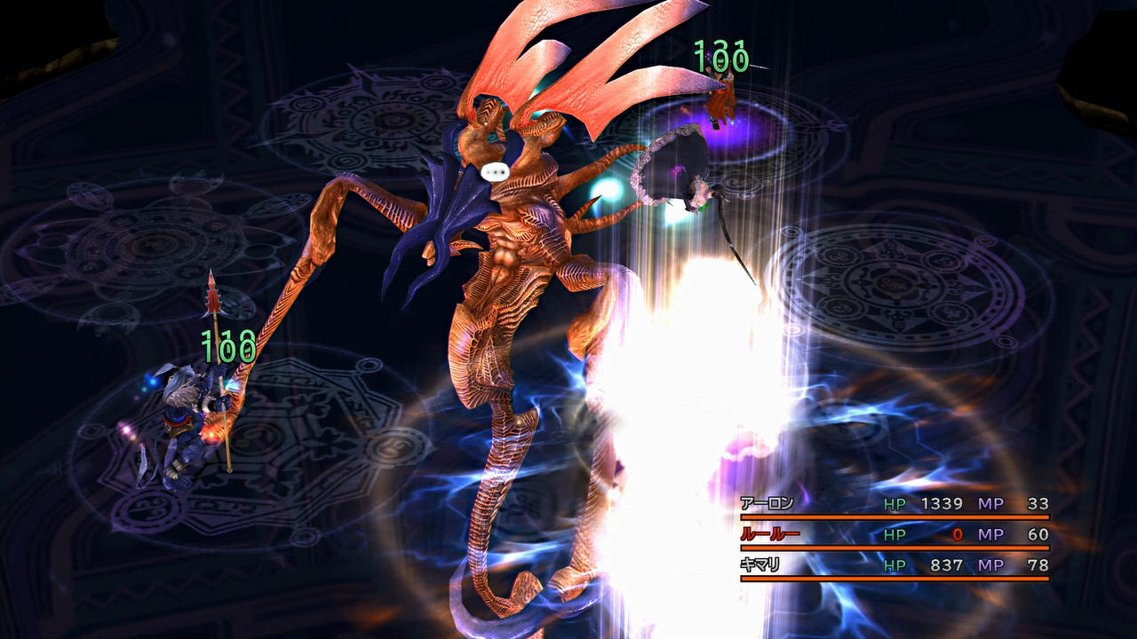 リジェネの回復量」を合算して戦闘不能にならないことが分かるため、魔法攻撃を行っていっても良い。キマリだとHP満タンでないと無理のため、ほとんどの場合はアーロンが反撃を受ける一番手となることだろう。