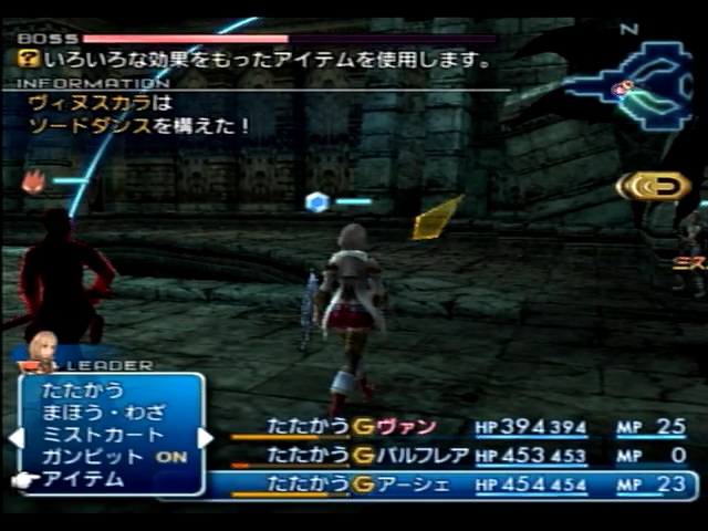 どういう事かというと、前述のとおりラーサーは某ハゲと違って自分から攻撃を仕掛けに行かないので、先ほどリーダーにしたパンネロがドンムブを仕掛けた後に(最低限の回復アイテムは使用しますが)何もせずに待機することで、ラーサーの敵への攻撃をやめさせつつ、ラーサーをHPの減った味方へのハイポーション使用に専念するヒーラーにします。ラーサーはHPが低く、ギルガメ相手では攻撃を仕掛けたところで大したダメージにならず、さらに近接武器で攻撃するのでギルガメの攻撃に巻き込まれてしまいやすいので、うかつにラーサーに攻撃させるとかえってアイテム消費が増えてしまう可能性があります。それならばいっそ攻撃せず回復アイテムを使い続けてくれた方が効率的であり、何よりハイポ皇子の本領発揮になりキャラを立てることが出来るでしょう。尤も、これほど注意しても、パンネロがドンムブを唱えている間だけはガンビットの「リーダーの敵->たたかう」が反応してしまい、ラーサーが敵に突っ込んでいってしまうのですが……そこは愛嬌という事で許しましょう。