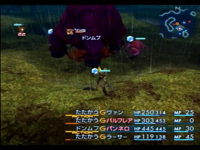 パンネロがギルガメを沈黙状態にすることに成功したら、パンネロをリーダーにして魔法の「ドンムブ」と前述の「魔法命中率マイナス必中」の裏技を使用してギルガメをドンムブ状態にします。ギルガメをドンムブ状態にしたらギルガメと距離を開けつつヴァンやバルフレア、バンサトが敵にダメージを与えていきます。この時、ヴァンやバルフレアはギルガメのドンムブが切れている間距離を調整できるように狂戦士状態にせずに攻撃します。ヴァン達が攻撃している間、パンネロは何もせずにひたすらグルグル回り続けてMPを回復します。そして敵のドンムブ状態が解除されたら敵の足の遅さを生かしてパンネロが逃げつつ再びドンムブを詠唱します。以降敵のHPを削りきるまでひたすらこれを繰り返します。